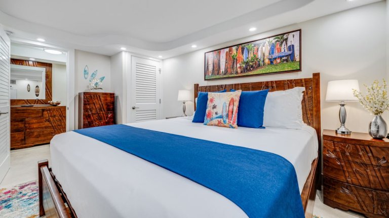 The open-concept living area features comfortable, island-inspired décor and a large smart television, creating an inviting environment for relaxation or casual gatherings. Sliding doors open to the expansive garden view lanai, allowing natural light and tropical scenery to flow seamlessly into the space.Sleeping Accommodations | Up to 4 Guests