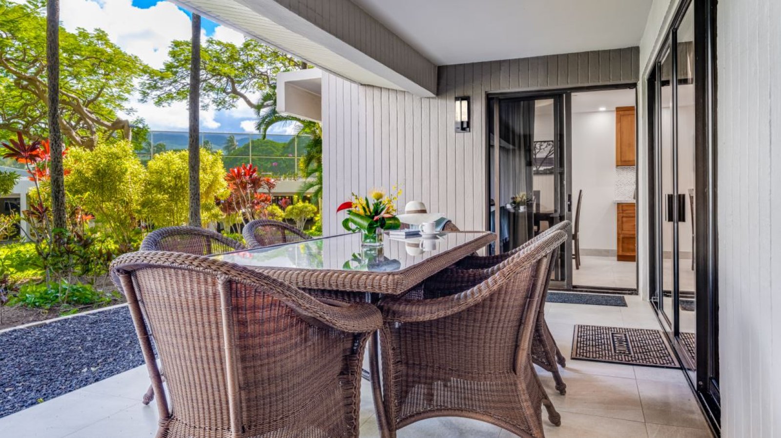 The fully equipped gourmet kitchen features granite countertops, stainless steel appliances, and bar seating for casual meals or conversation while cooking. The indoor dining area comfortably seats six guests, while the lanai extends the dining experience outdoors with space for alfresco meals overlooking the tropical gardens.Outdoor Living