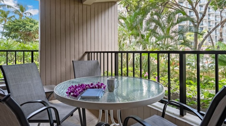 The private lanai features lounge chairs and a table, offering a peaceful garden view setting for morning coffee or evening relaxation. Guests enjoy immediate access to resort amenities, including pools, tennis courts, and barbecue stations, all just moments away.Location