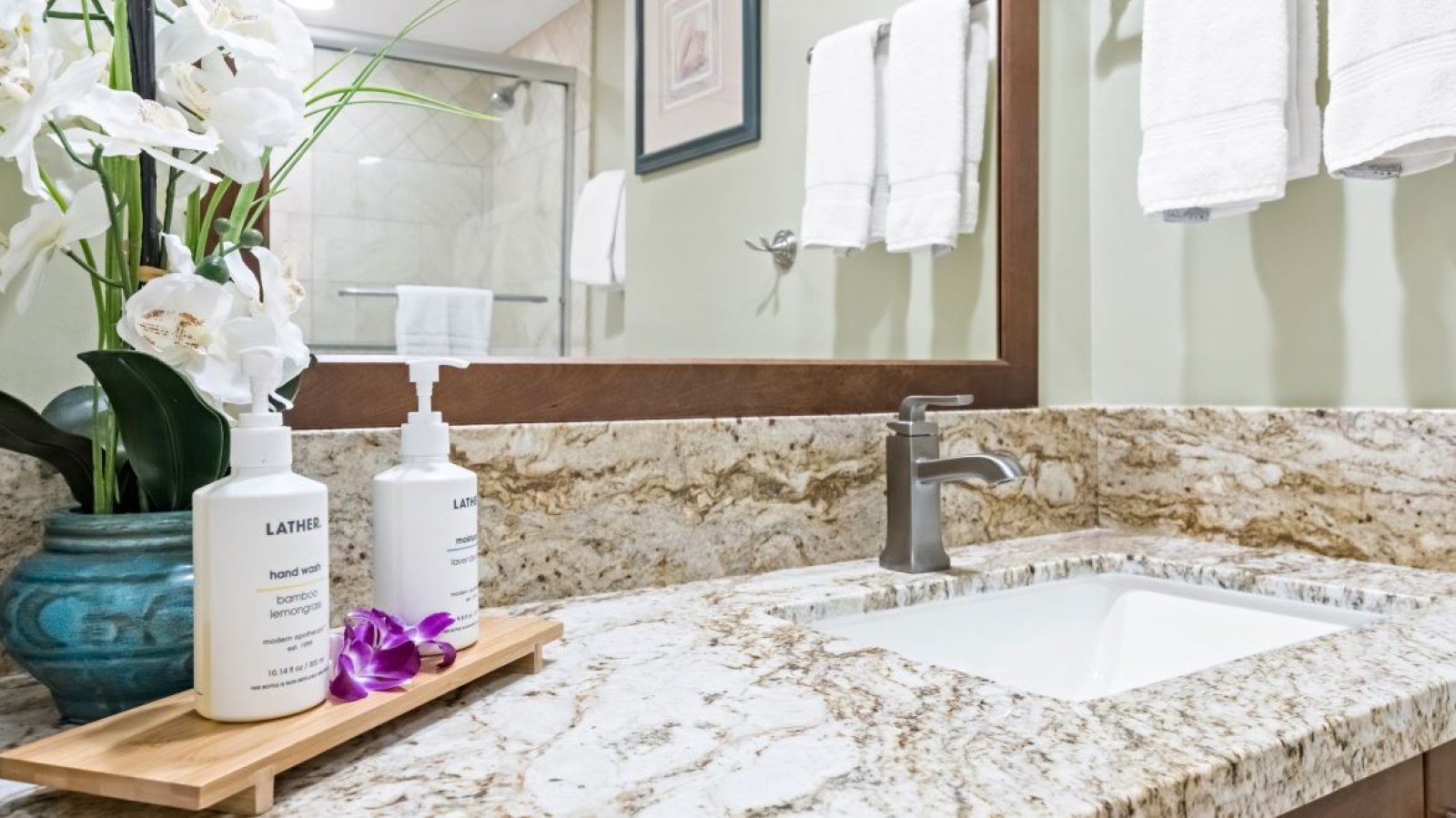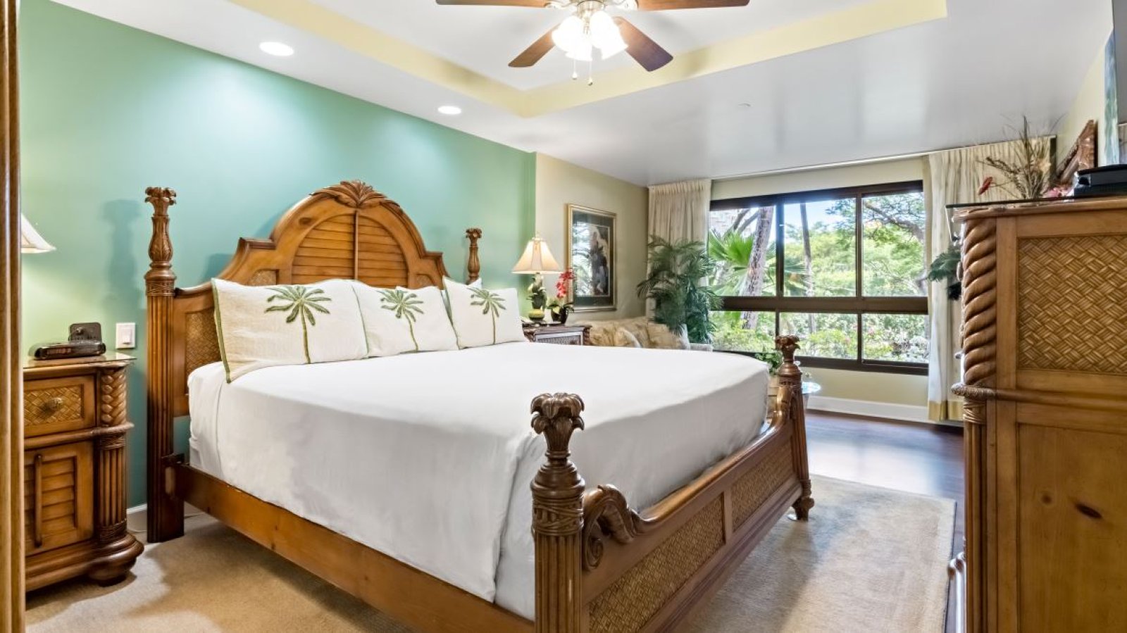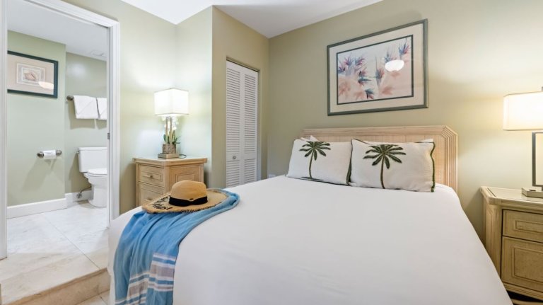 Features a California king bed, refined island décor, and ample storage. The en-suite bathroom includes a walk-in shower with elegant finishes.