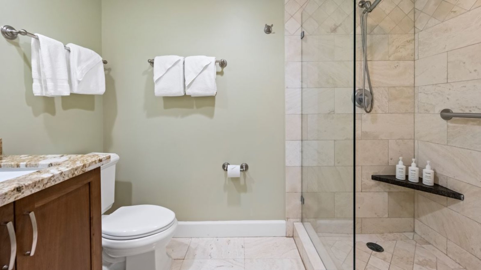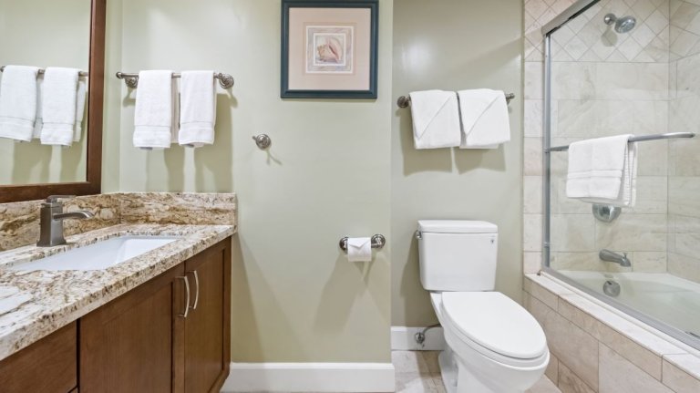 A second full bathroom includes a step-in shower with tub, offering convenience for all guests.