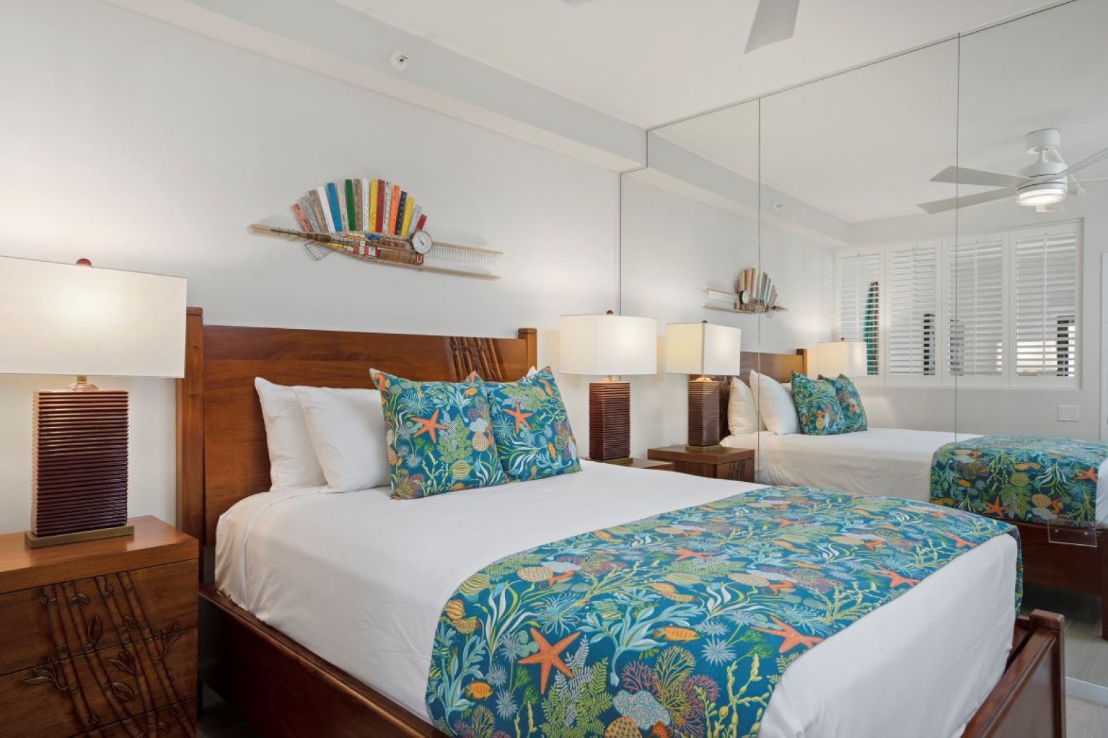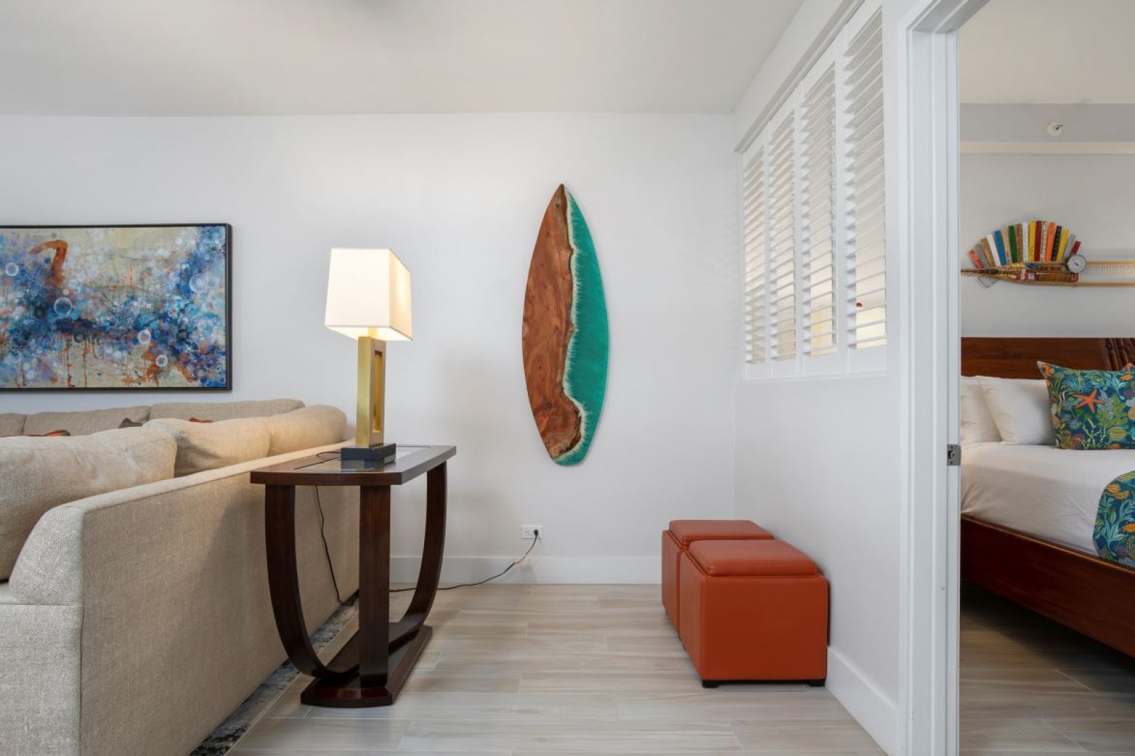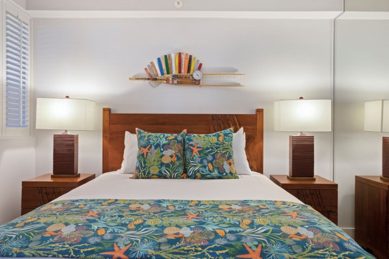 Features a king bed, flat-screen TV with cable, generous drawer space, and a dedicated desk area ideal for remote work. An additional seating area enjoys ocean views, creating a serene retreat. The en-suite bathroom includes a walk-in shower, a separate vanity area, and an in-residence laundry space with additional storage.
