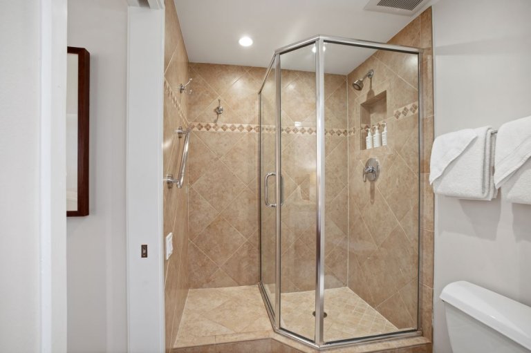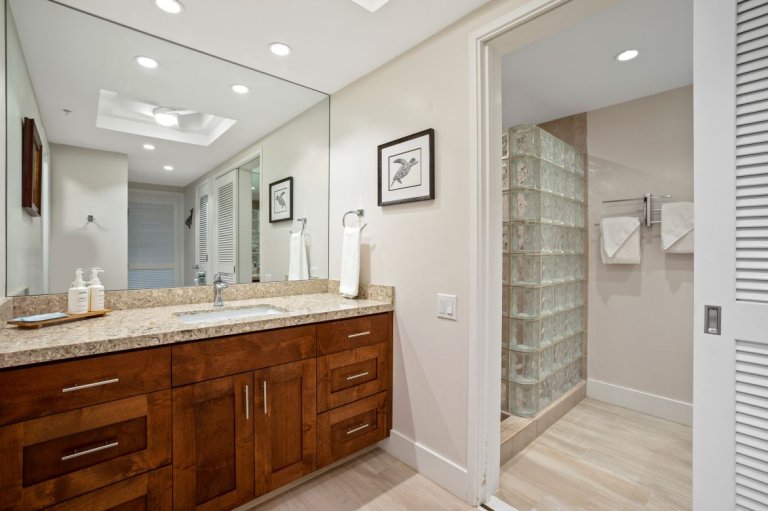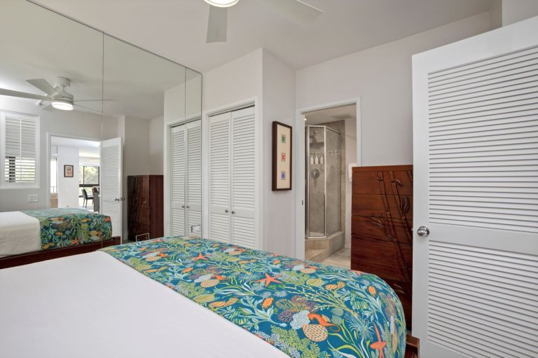 Fully enclosed for privacy and furnished with a queen bed, this space functions as a true second sleeping area. The attached second bathroom features a shower and separate vanity, providing convenience and comfort for additional guests.