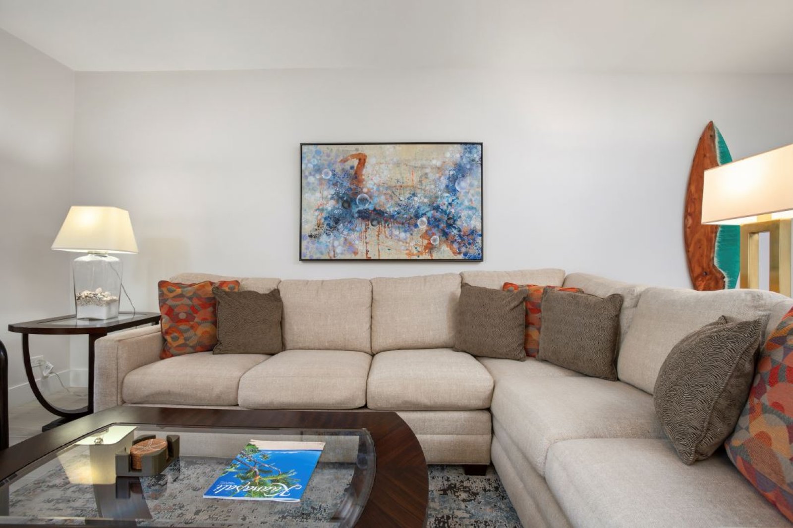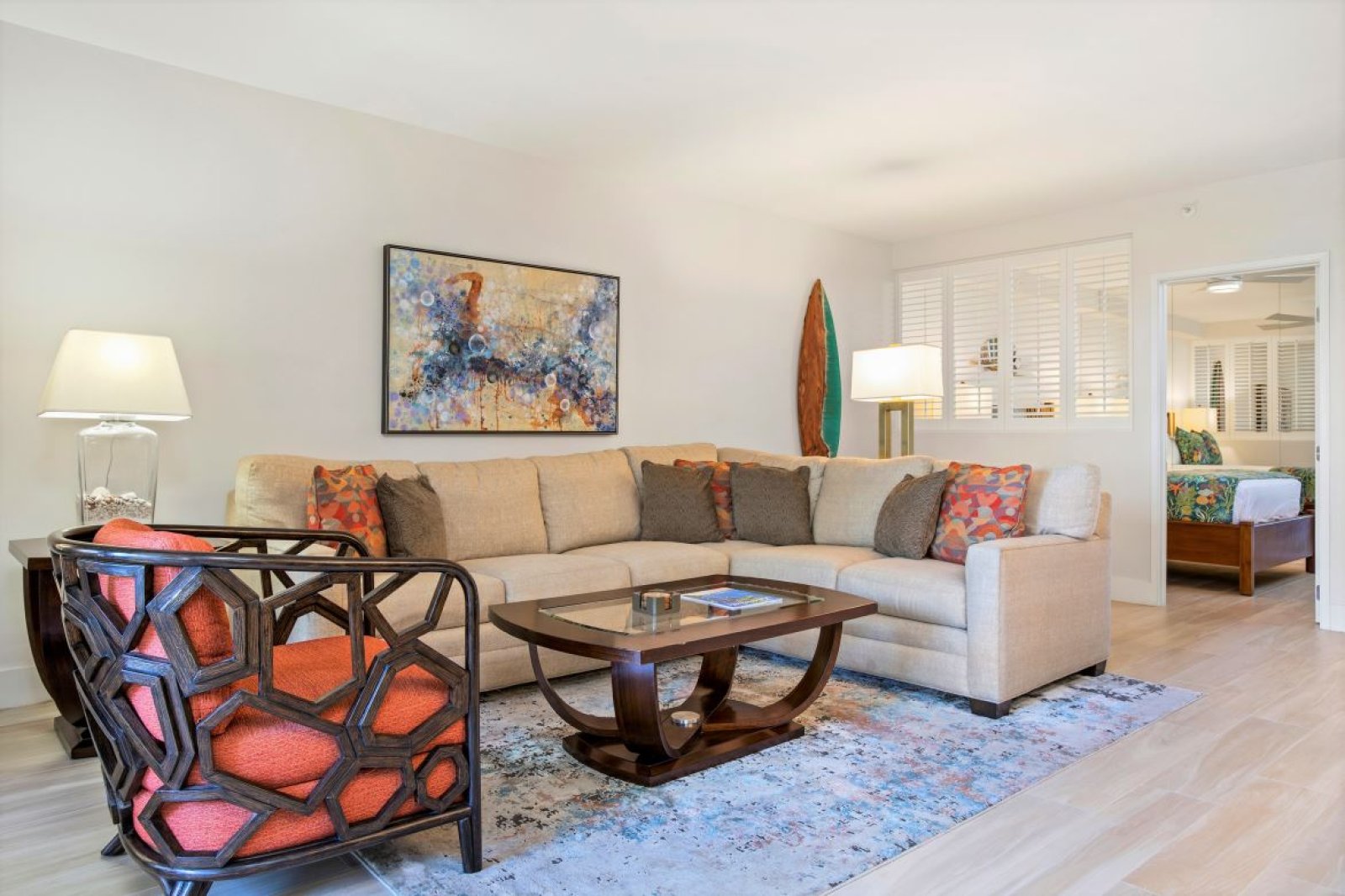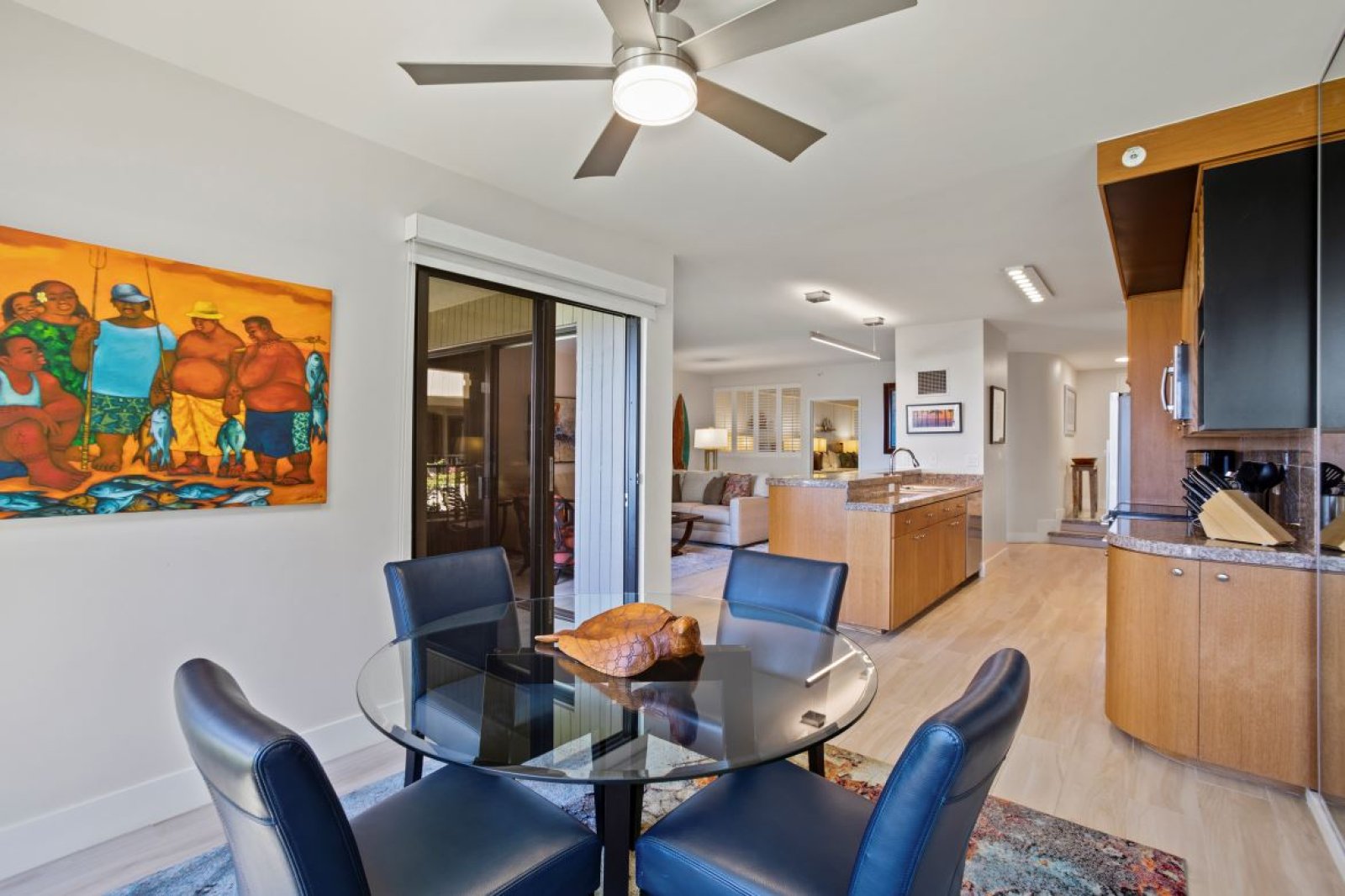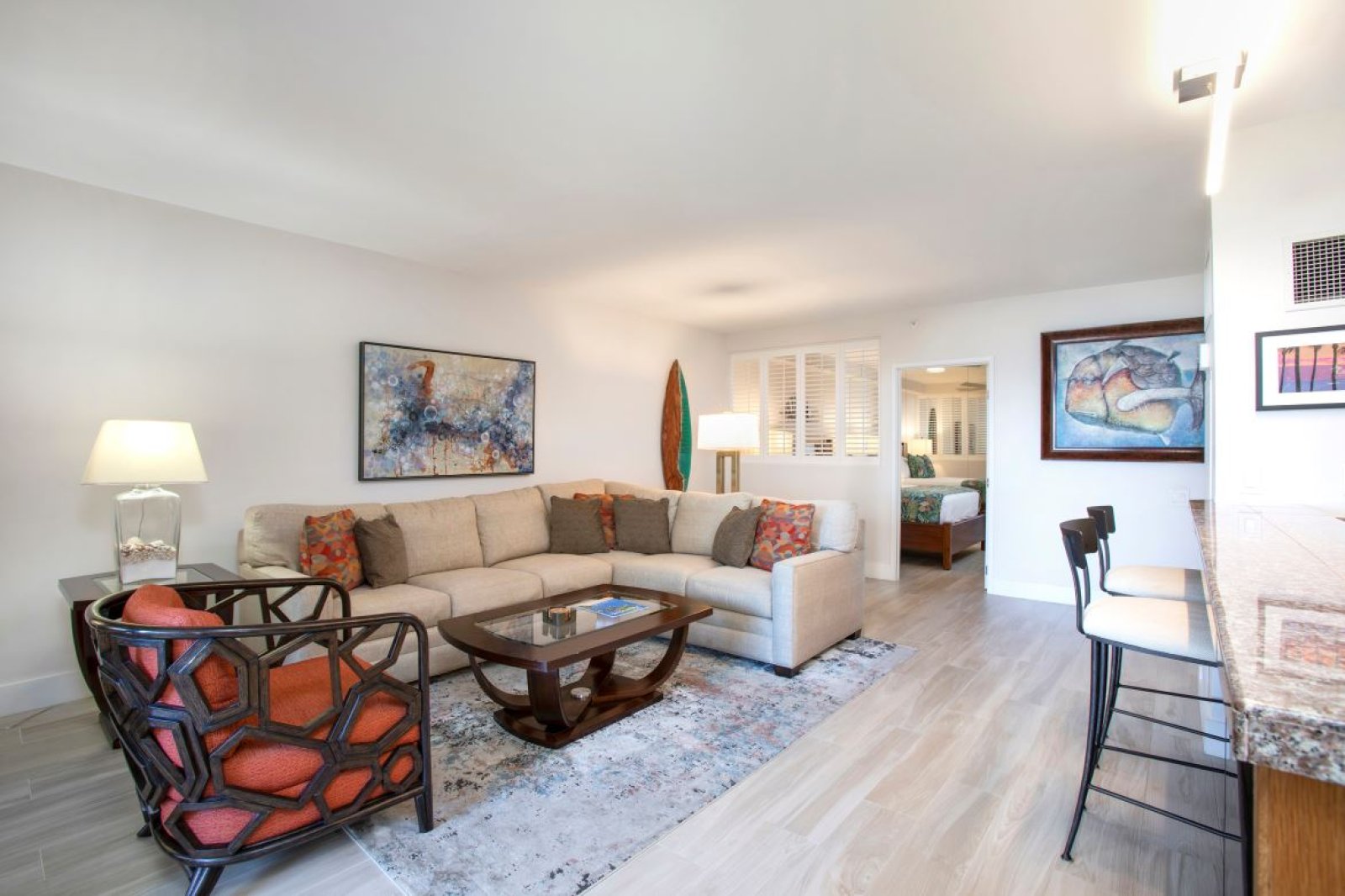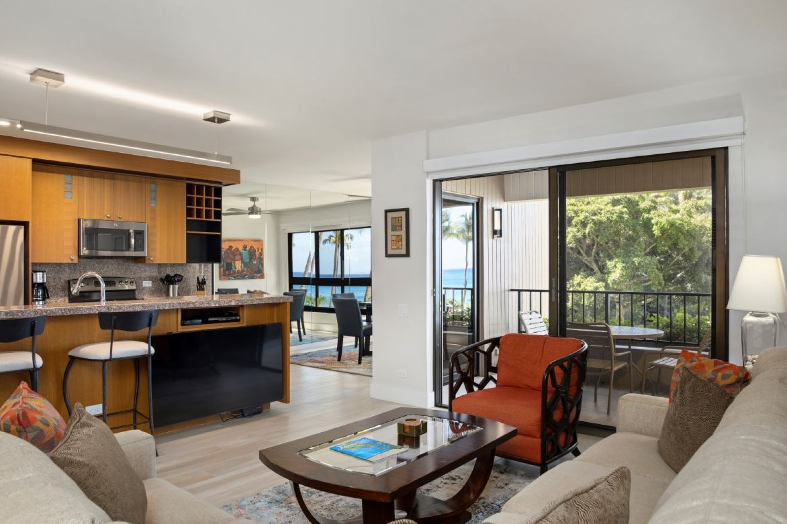 The interior design blends warm, modern finishes with a relaxed island aesthetic. Multiple seating areas create inviting spaces to gather, unwind, or enjoy quiet moments apart. The open layout connects the living room, kitchen, and dining area, allowing easy conversation and a natural flow throughout the home.Large windows and lanai access bring in natural light and showcase soothing ocean views, enhancing the calm and welcoming atmosphere.