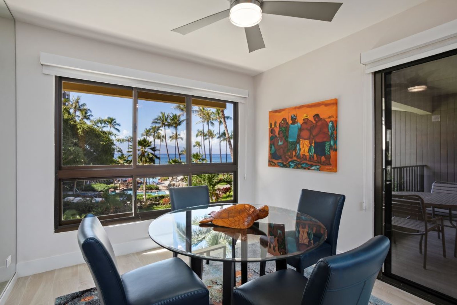 The fully equipped gourmet kitchen features granite countertops, stainless steel appliances, and bar seating for two at the island. The open design allows guests to engage with the chef while meals are prepared. Appliances include a microwave, dishwasher, and oven, along with a coffee maker, blender, toaster, and a rice cooker available upon request.The separate dining area comfortably seats four, while outdoor dining on the private lanai also accommodates four, offering the option to enjoy meals with ocean breezes and sunset views.