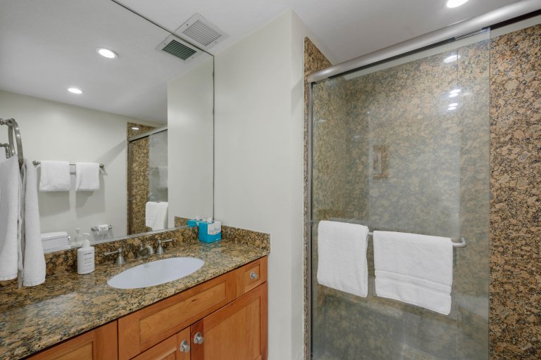 Features a California king bed, refined furnishings, and a peaceful retreat after a day at the beach. The en-suite bathroom includes a walk-in shower with elegant finishes.
