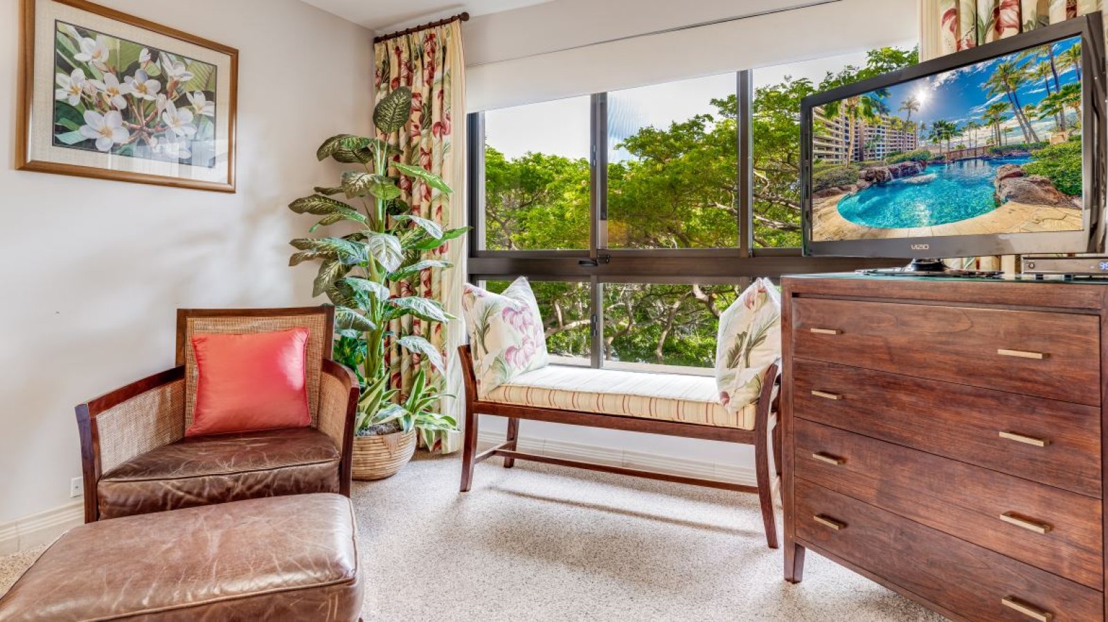 Welcome to Kaanapali Alii 255, a stunning two-bedroom, two-bathroom ocean-view residence that blends contemporary comfort with vibrant island style. Designed to accommodate up to six guests, this spacious vacation home showcases sweeping views of the Pacific Ocean and sandy shoreline through expansive windows in every room. Step onto the private lanai to feel the ocean breeze and fully embrace the beauty of Maui.Living Spaces