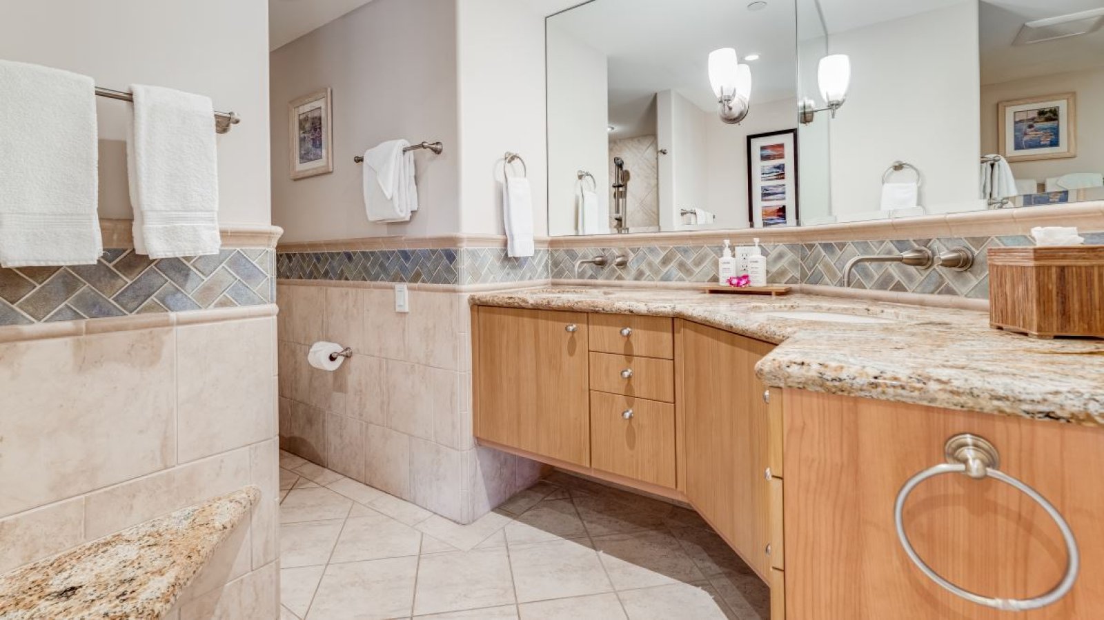 Features a California king bed, flat-screen TV with basic cable, and an additional seating area—perfect for enjoying a morning coffee or unwinding with a book. The en-suite bathroom includes a walk-in shower and double vanity.