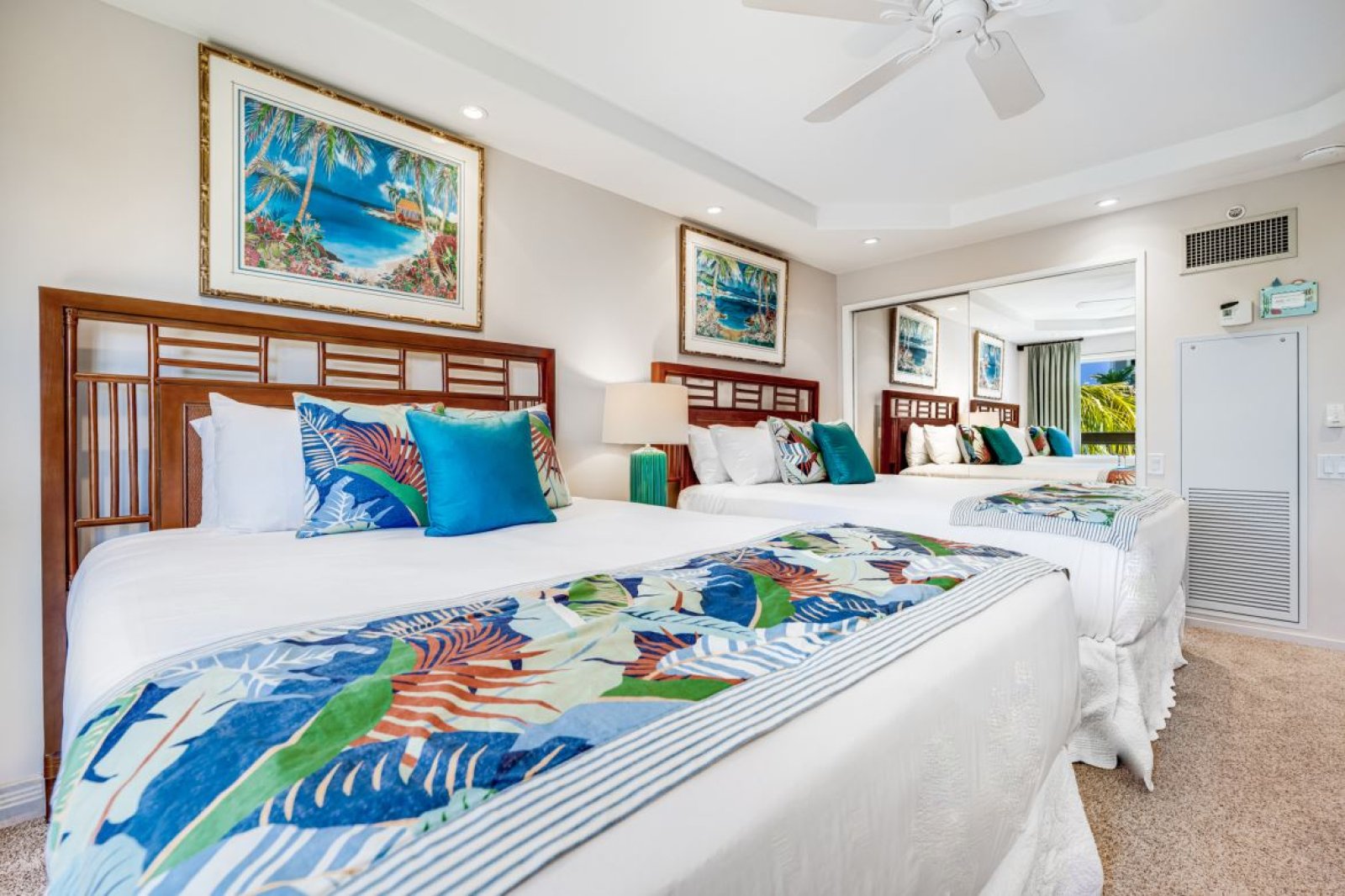 Includes two queen beds, ocean views, and a flat-screen TV for private viewing. The adjacent bathroom also features a walk-in shower.