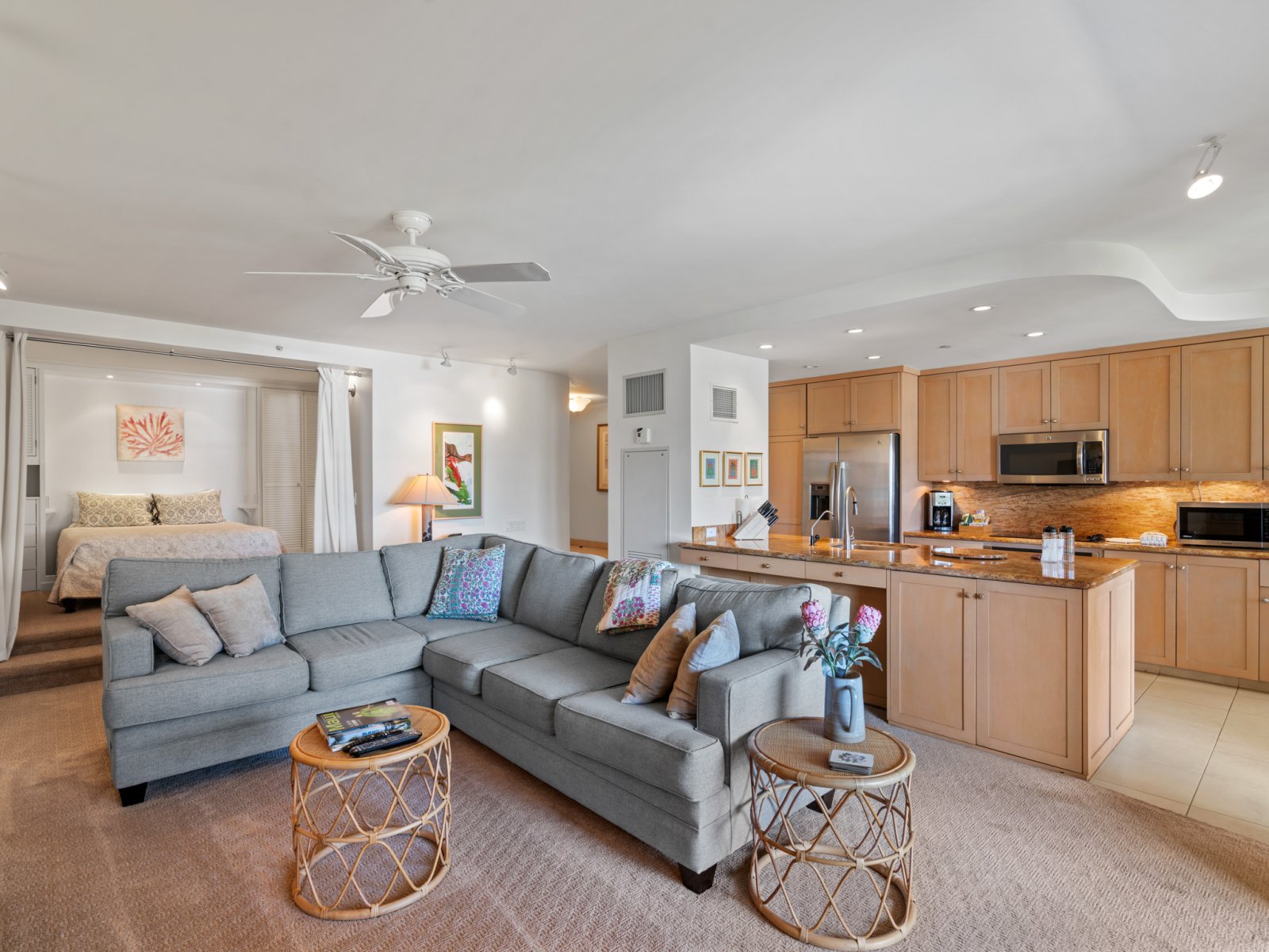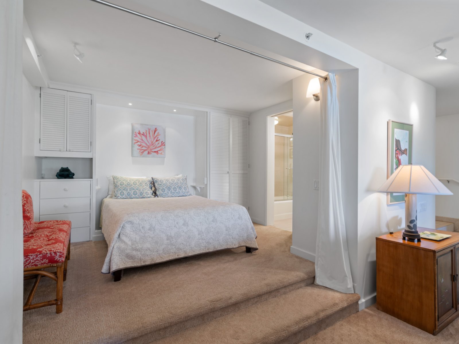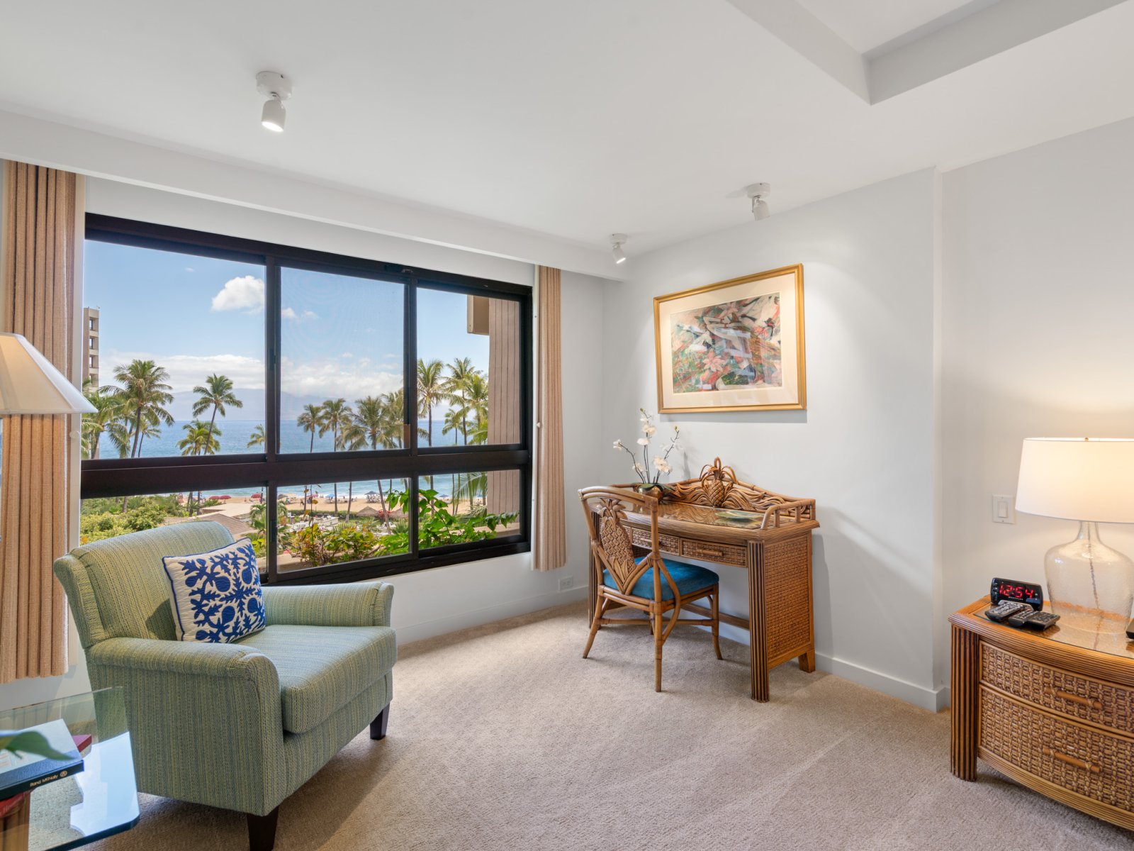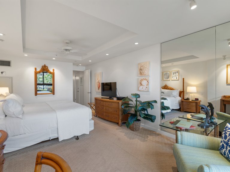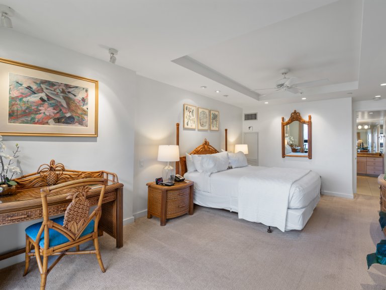 The open-concept living area is designed for both relaxation and entertaining. Comfortable seating, refined furnishings, and abundant natural light create an inviting space to unwind after a day at the beach. Large sliding doors open to the lanai, allowing ocean breezes and tropical views to become part of everyday living. An enclosable den offers flexibility and privacy when needed.Sleeping Accommodations | Up to 4 Guests