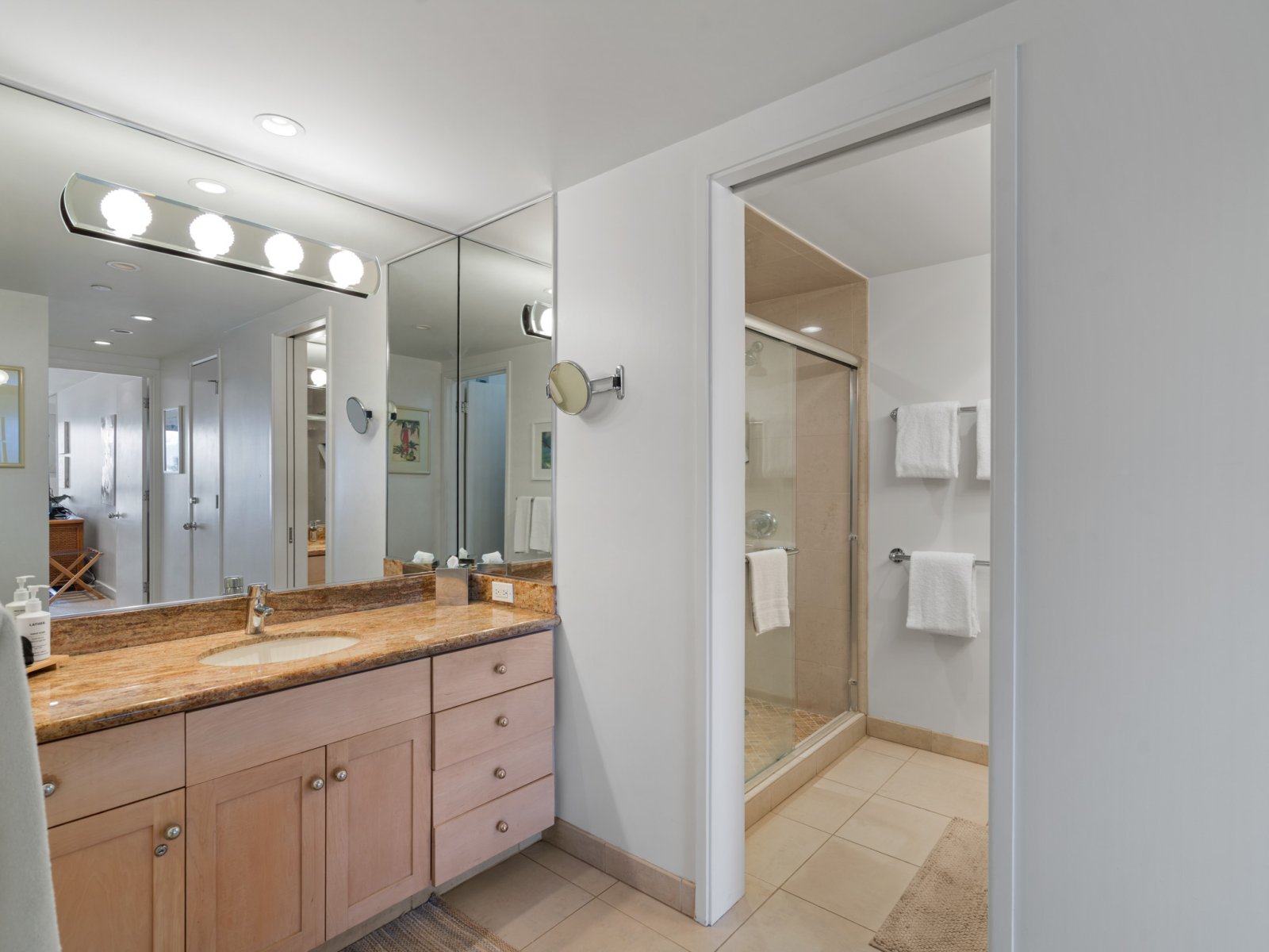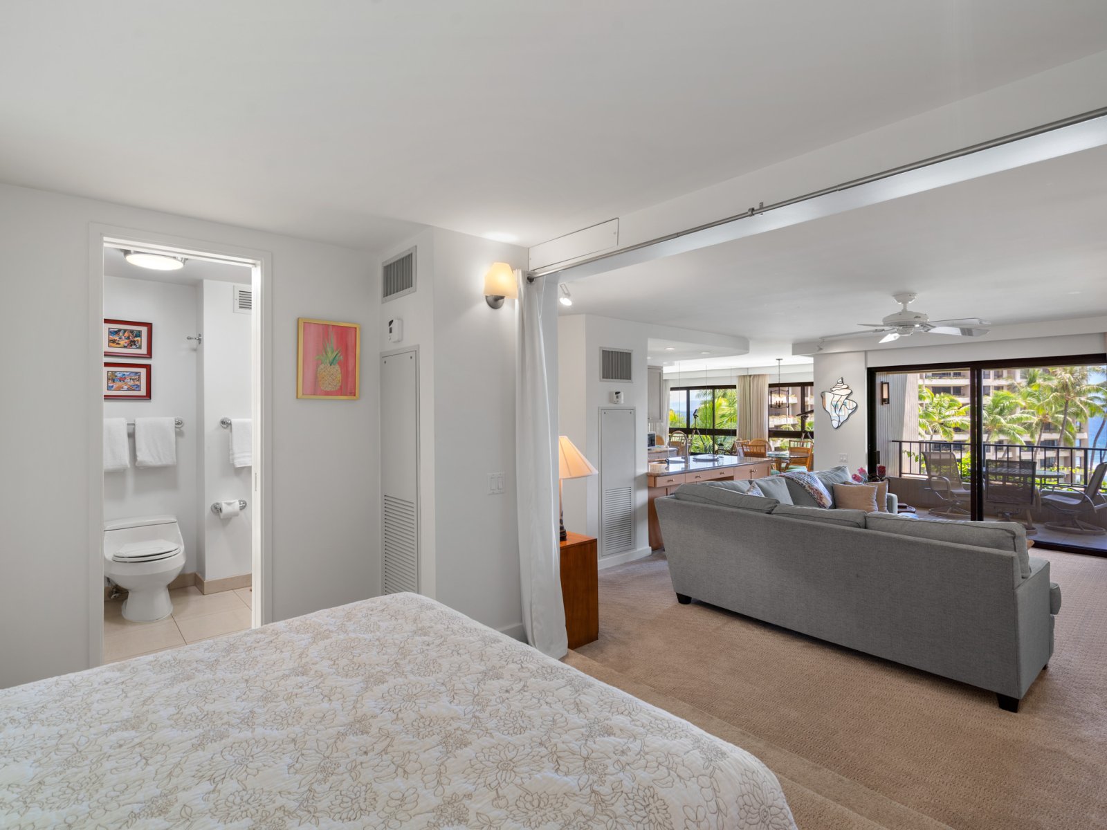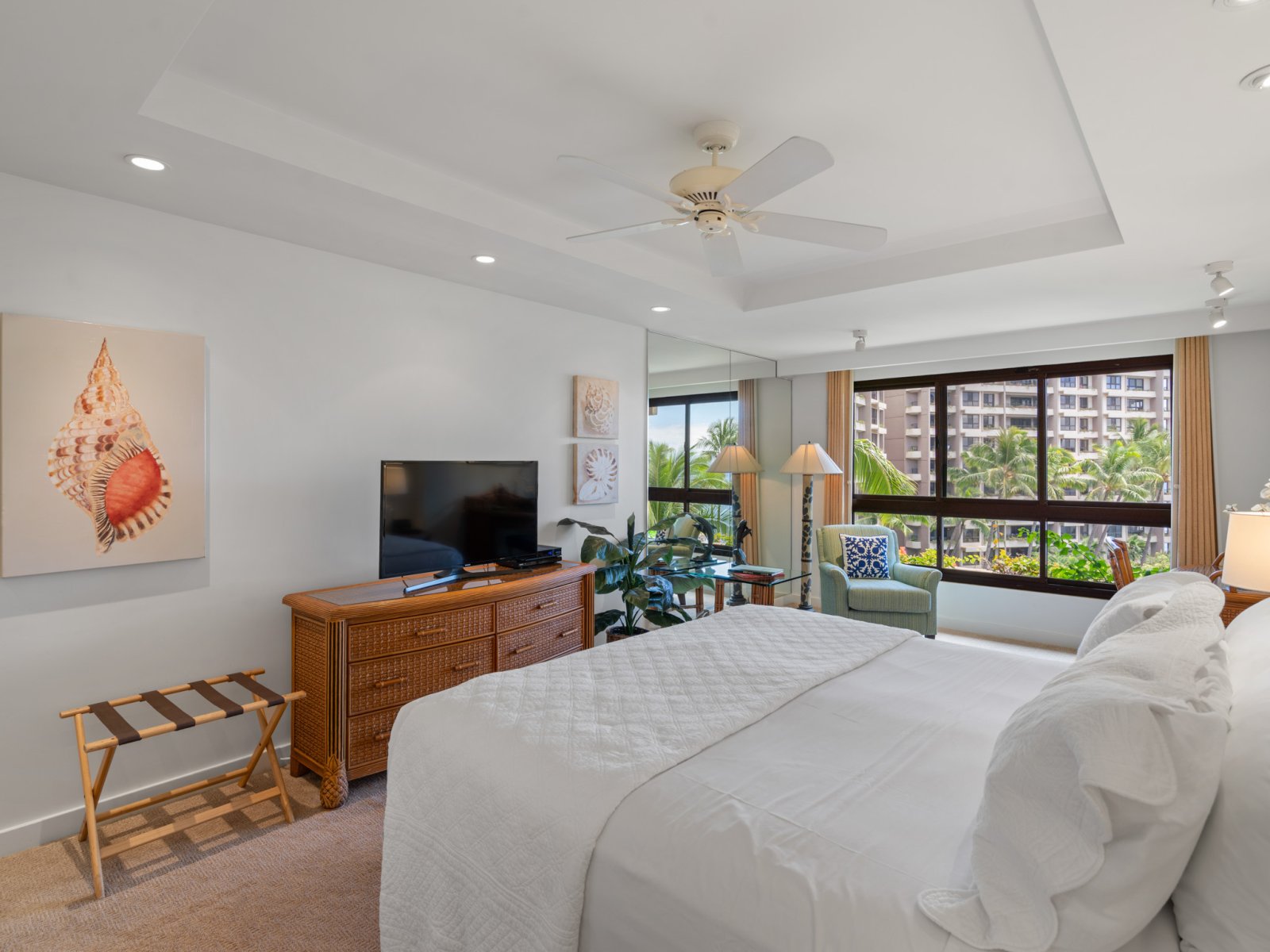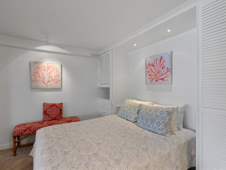 The open-concept living area is designed for both relaxation and entertaining. Comfortable seating, refined furnishings, and abundant natural light create an inviting space to unwind after a day at the beach. Large sliding doors open to the lanai, allowing ocean breezes and tropical views to become part of everyday living. An enclosable den offers flexibility and privacy when needed.Sleeping Accommodations | Up to 4 Guests