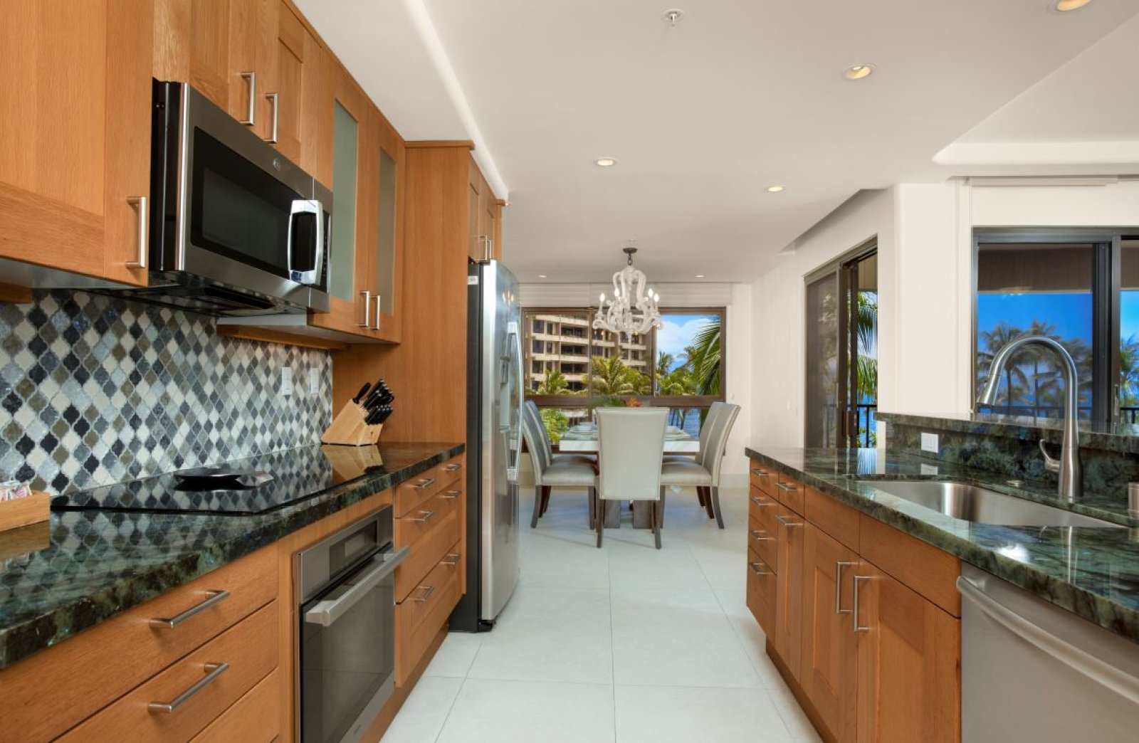 The fully equipped gourmet kitchen opens directly to the living area, making it ideal for socializing while preparing meals. Appointed with granite countertops and stainless steel appliances, including stove, oven, microwave, refrigerator, and dishwasher, the kitchen offers both function and style.Indoor dining comfortably seats six, while the oceanview lanai provides alfresco dining for four, allowing you to enjoy Maui’s gentle trade winds with every meal.