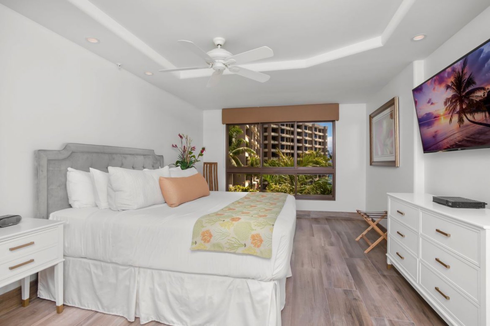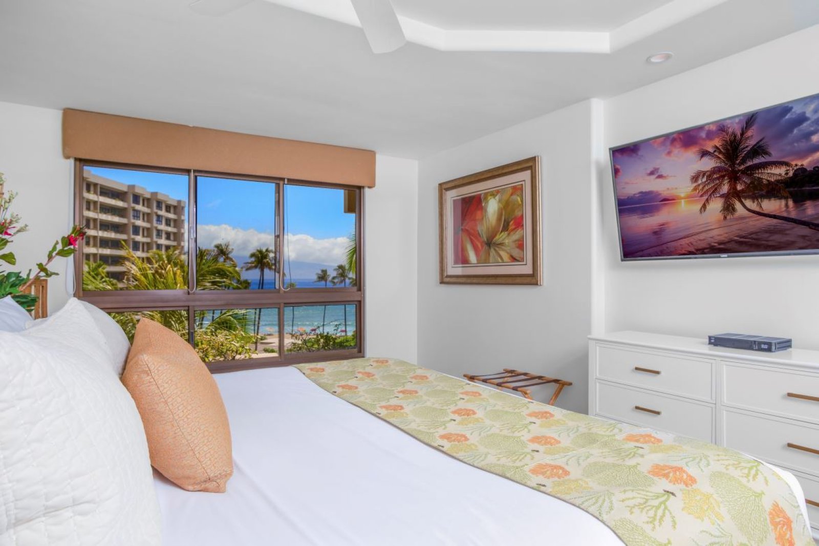 Situated directly on Kaanapali Beach, this residence places you just steps from swimming, snorkeling, sunbathing, and beachfront dining. Whalers Village is a short five-minute walk, offering upscale shopping, dining, and entertainment. Championship golf courses are only a two-minute drive away, providing easy access to premier island recreation.Bedrooms and Amenities