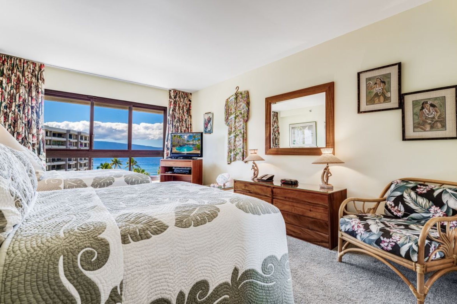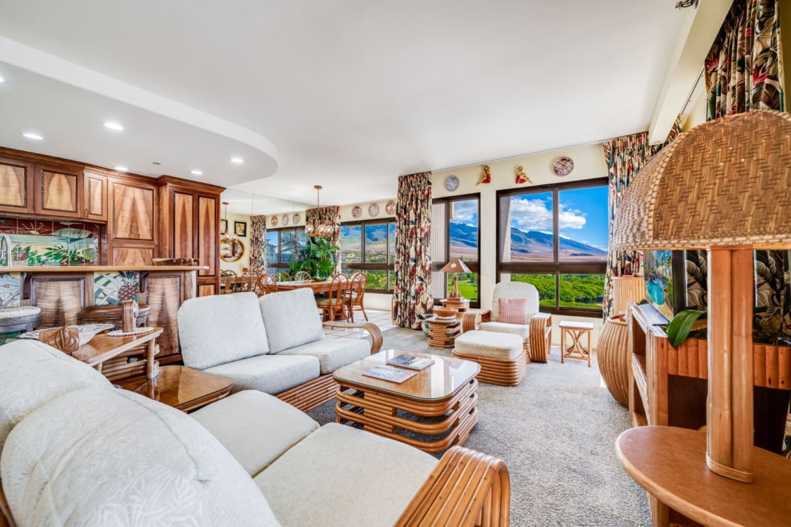 Welcome to Kaanapali Alii 295, a beautifully curated two-bedroom oceanview residence that celebrates the warmth of Hawaiian hospitality and timeless island style. Located within the prestigious Kaanapali Alii Resort and set directly on Kaanapali Beach, this inviting retreat offers sweeping views of the Pacific Ocean and the soothing rhythm of the waves below.Spanning 1,788 square feet, the residence blends classic Hawaiiana décor, antique accents, and rich wood details with modern comforts. Expansive windows flood the interiors with natural light, creating a welcoming and relaxed atmosphere ideal for an elevated Maui vacation.