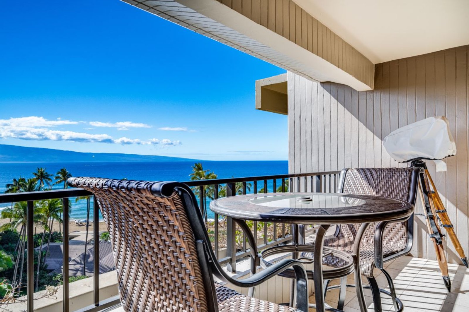 Step onto the private lanai to enjoy panoramic ocean views, outdoor dining, and gentle island breezes. Whether savoring morning coffee or evening sunsets, this outdoor space serves as a tranquil extension of the living area. The sandy shoreline of Kaanapali Beach is just steps away.- Resort Amenities Included
