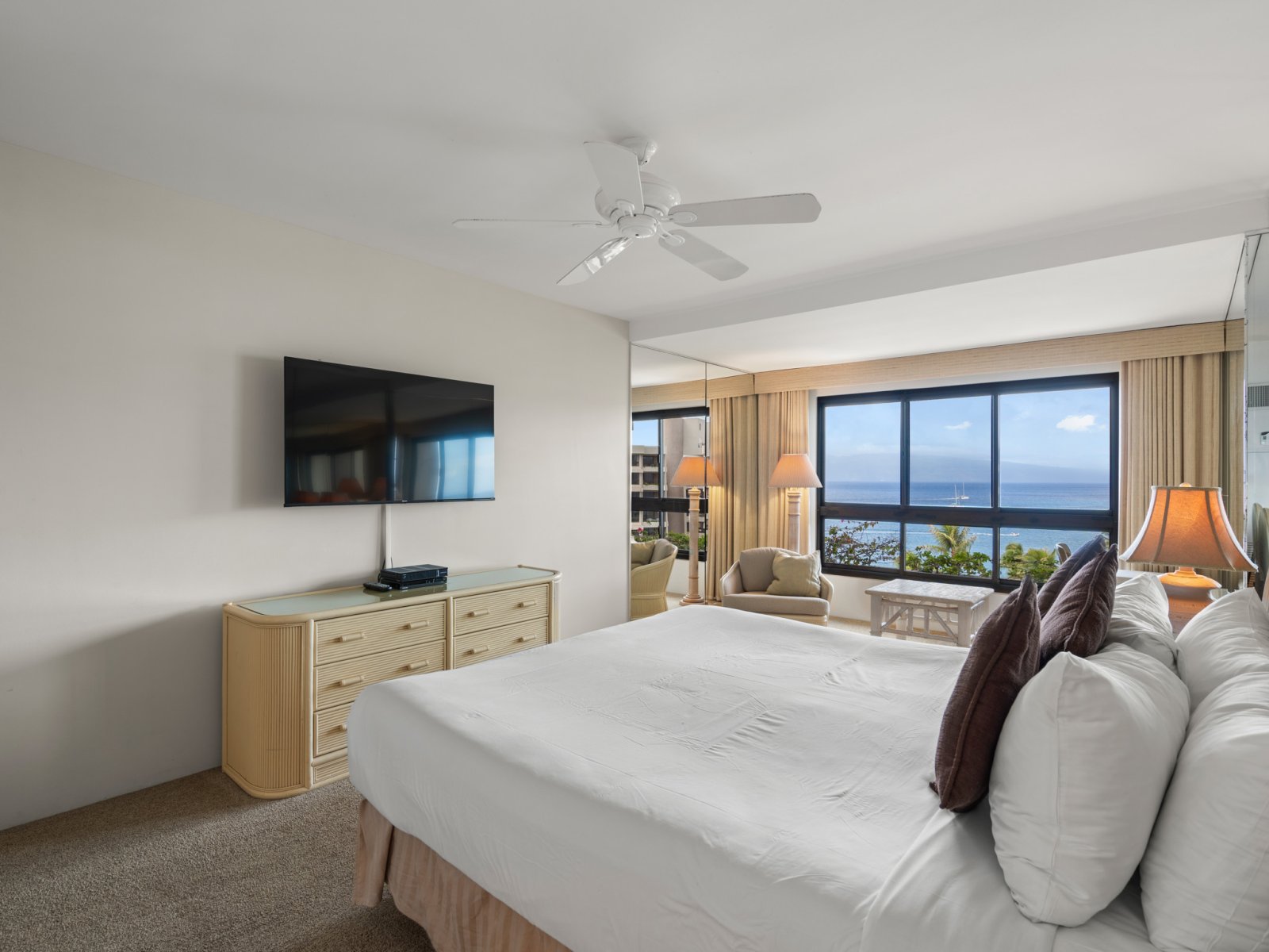 The open and spacious layout is designed for effortless island living. A plush sectional sofa, inviting seating areas, and abundant natural light make the living room a perfect place to gather, unwind, or enjoy a movie night—always with ocean views close at hand.Sleeping Accommodations | Up to 4 Guests