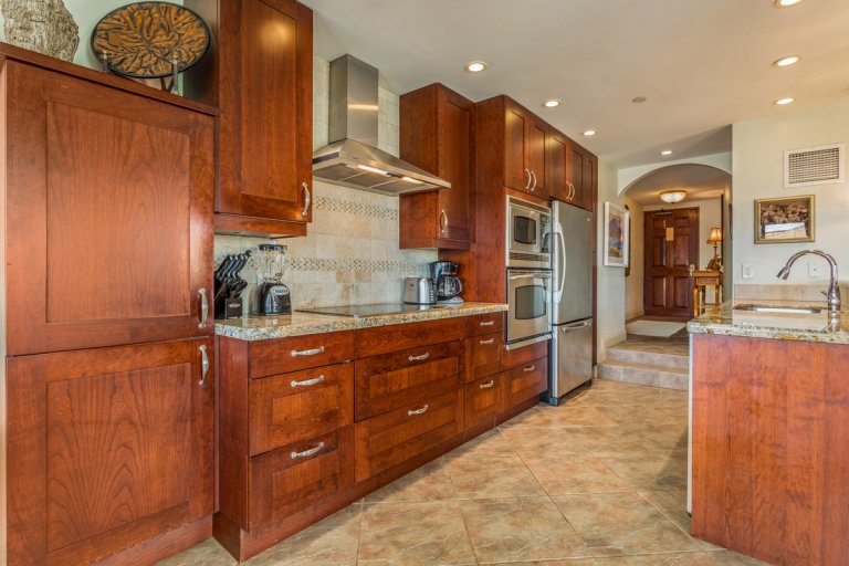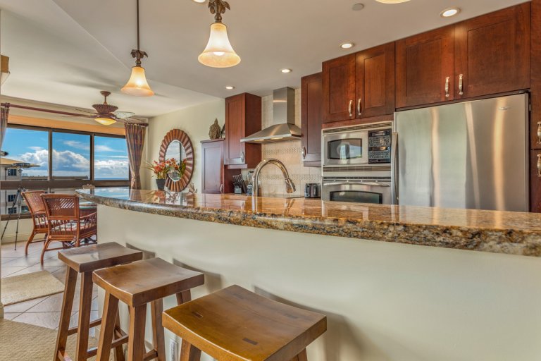 The gourmet kitchen is fully equipped for in-residence dining, featuring contemporary appliances, marble and granite countertops, and ample cabinetry. Bar seating at the kitchen counter offers a relaxed space for breakfast or casual meals. Guests may also choose to dine on the lanai, where mountain and ocean views provide a beautiful backdrop for any occasion.Outdoor Living