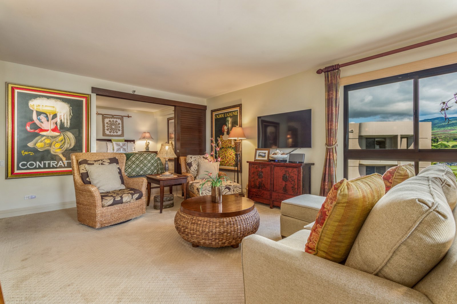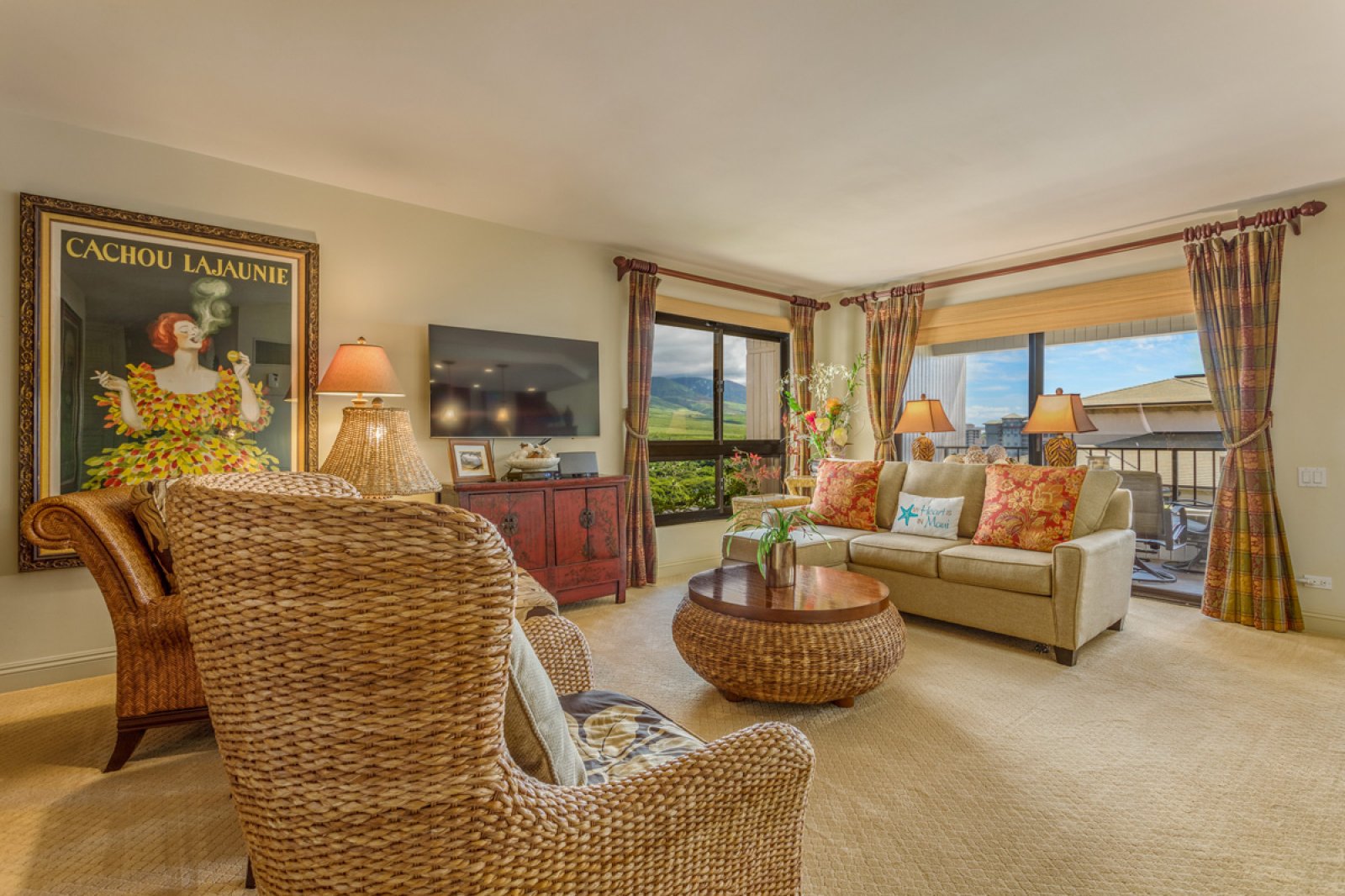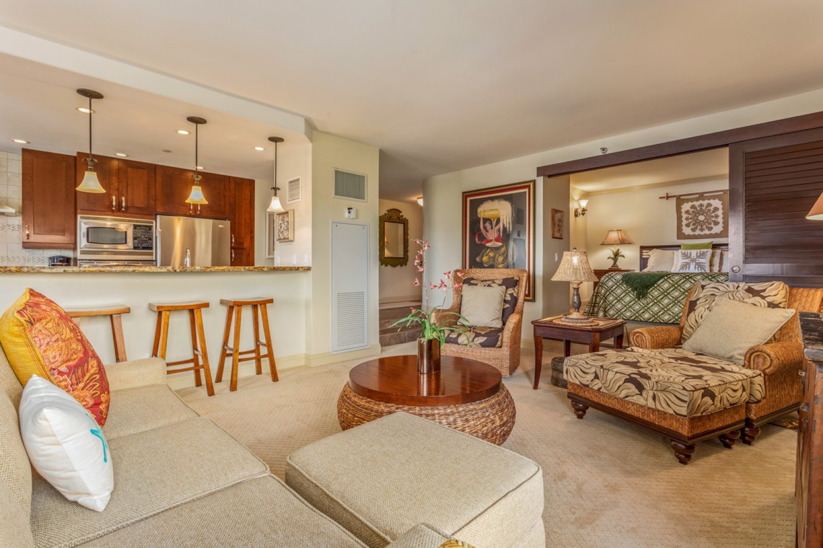 Welcome to Residence 3112, a refined one-bedroom condominium with sleeping den, ideally situated within the oceanfront grounds of Kaʻanapali Alii Resort. Located on the 11th floor, this spacious residence offers a peaceful garden setting complemented by partial ocean and mountain views, creating a calm and luxurious home base on one of Maui’s most celebrated beaches.Thoughtfully designed interiors blend relaxed island character with polished finishes. Natural textures, rattan accents, tropical fabrics, and bold artwork evoke a distinctly Hawaiian sense of place while maintaining a sophisticated, upscale aesthetic.