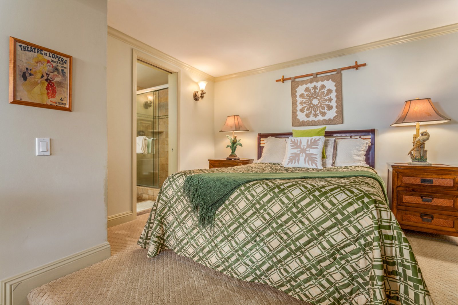 The open-concept living area is designed for comfort and effortless relaxation. Plush seating includes a sofa with ottoman, lounge chair, and armchair, all positioned to enjoy the natural light and surrounding views. A flat-screen television and curated art pieces complete the space, making it equally suited for quiet evenings or casual entertaining. Sliding doors open to the private lanai, enhancing indoor-outdoor living.Sleeping Accommodations | Up to 4 Guests