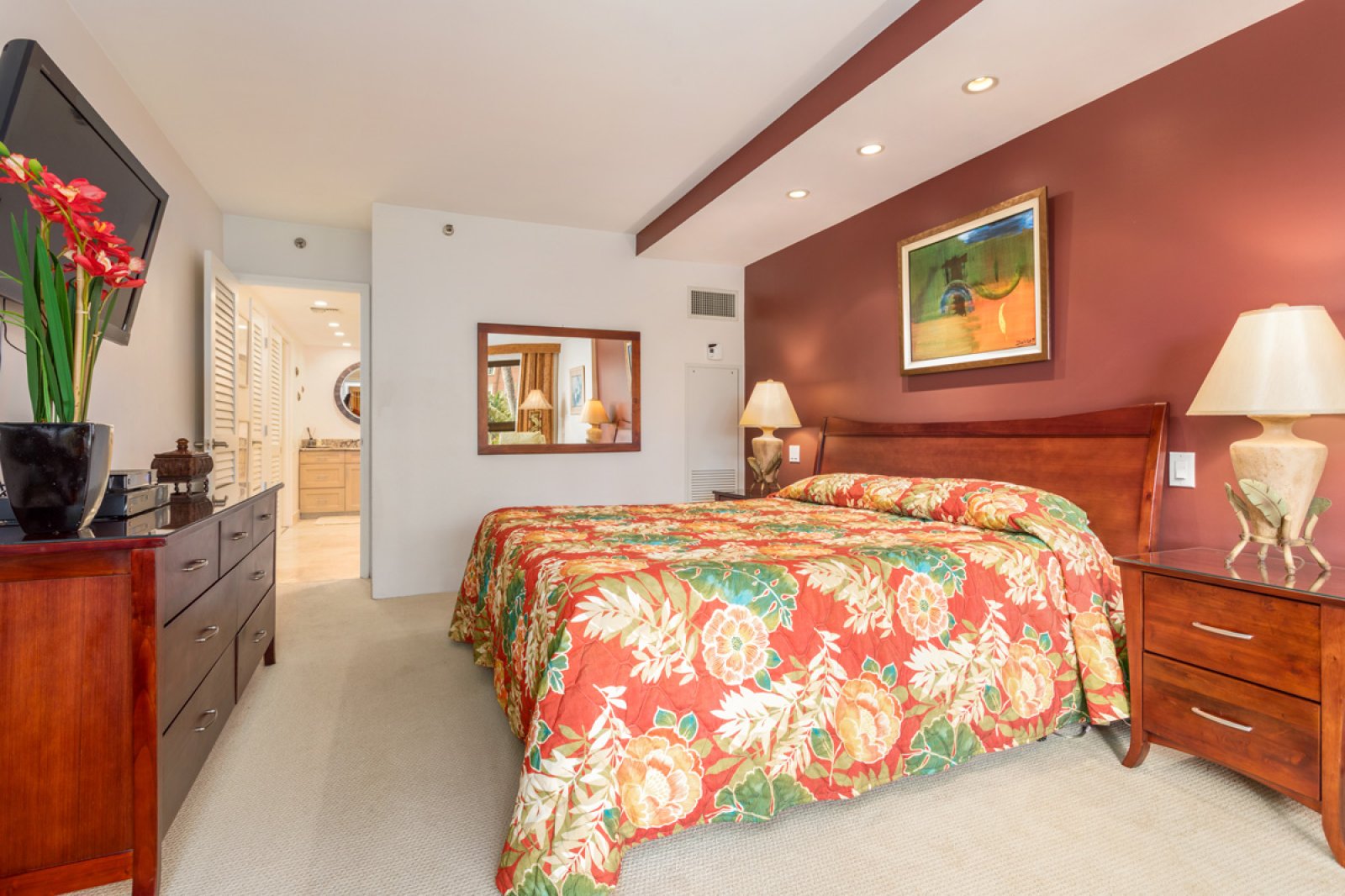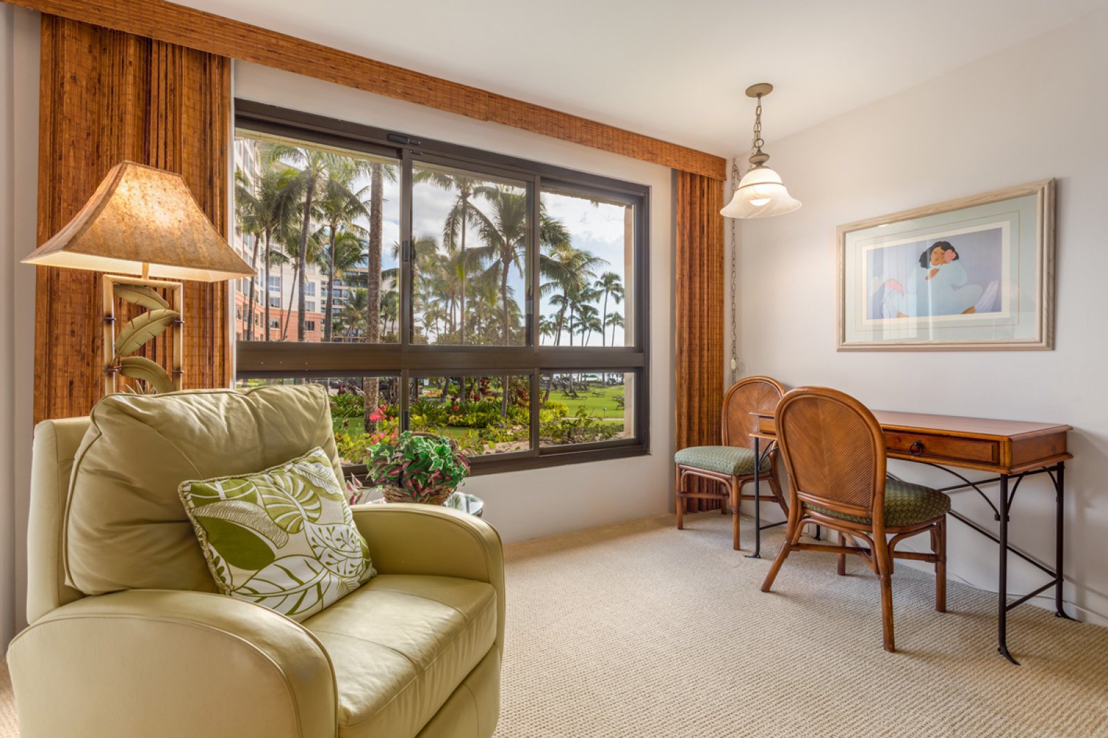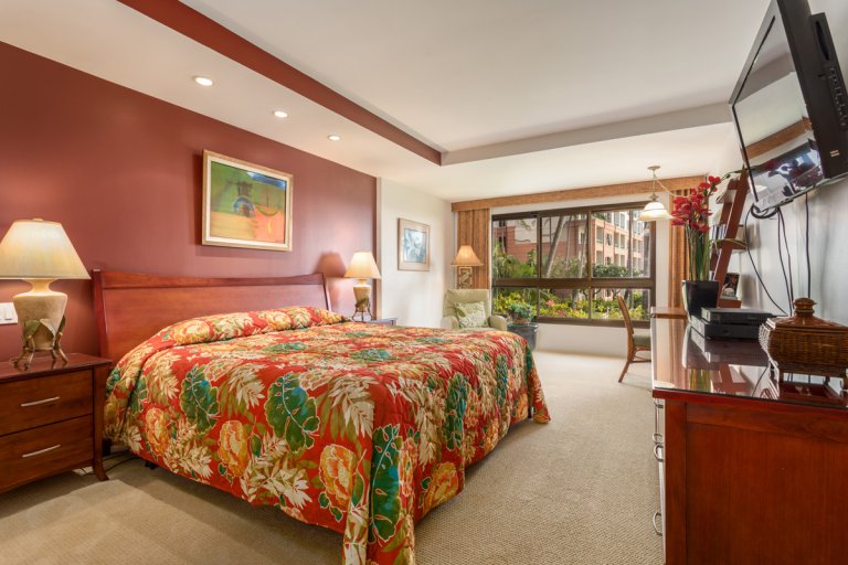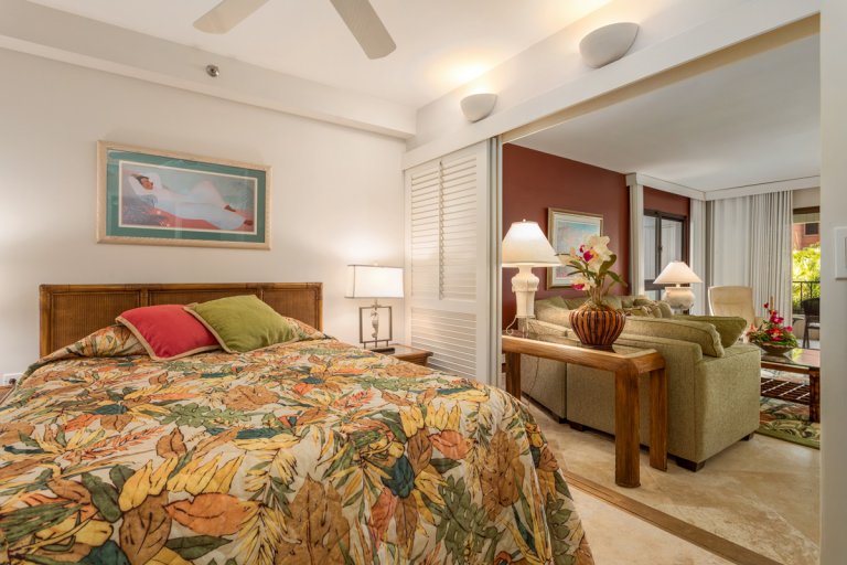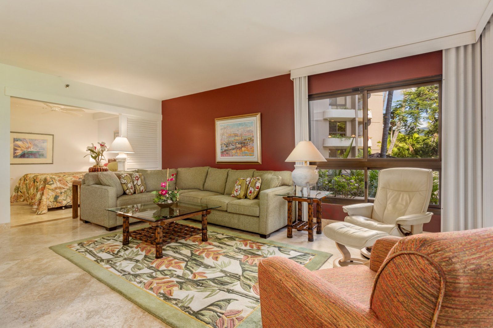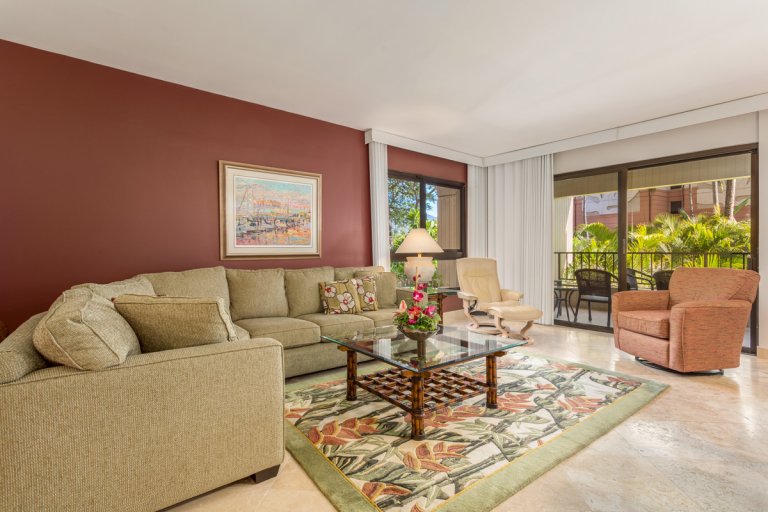 The living area is stylish and inviting, featuring a contemporary beige leather lounger with a matching ottoman, a plush sectional sofa, and distinctive burgundy accent walls that add depth and character to both the living and dining spaces. Sliding glass doors open to a private lanai furnished to seat four, offering a peaceful setting to enjoy garden views and gentle island breezes.Sleeping Accommodations | Up to 4 Guests