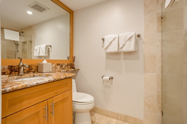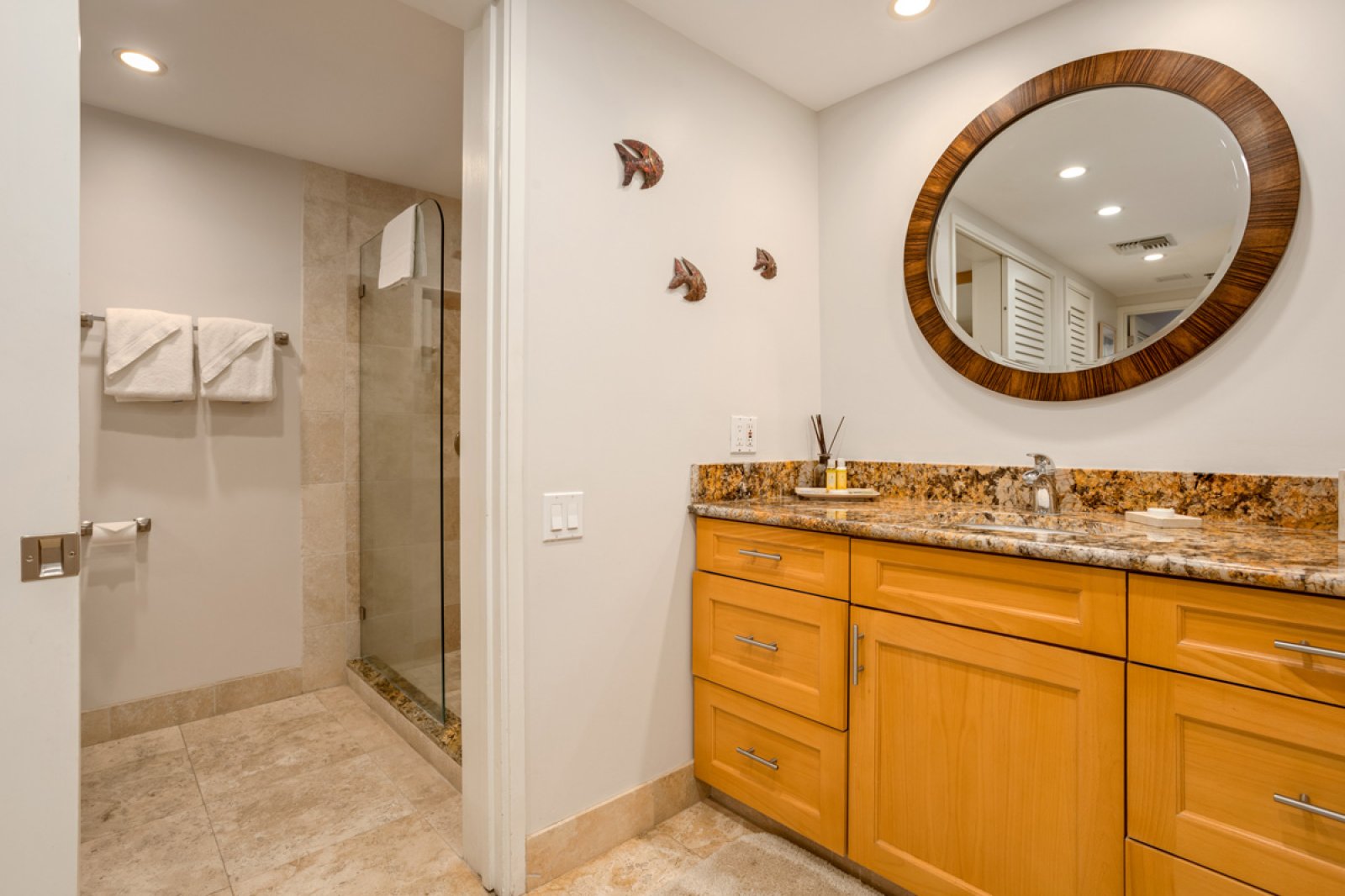 The enclosed den features a queen bed and convenient access to an adjacent bathroom with a vanity and walk-in glass shower, making it ideal for additional guests.