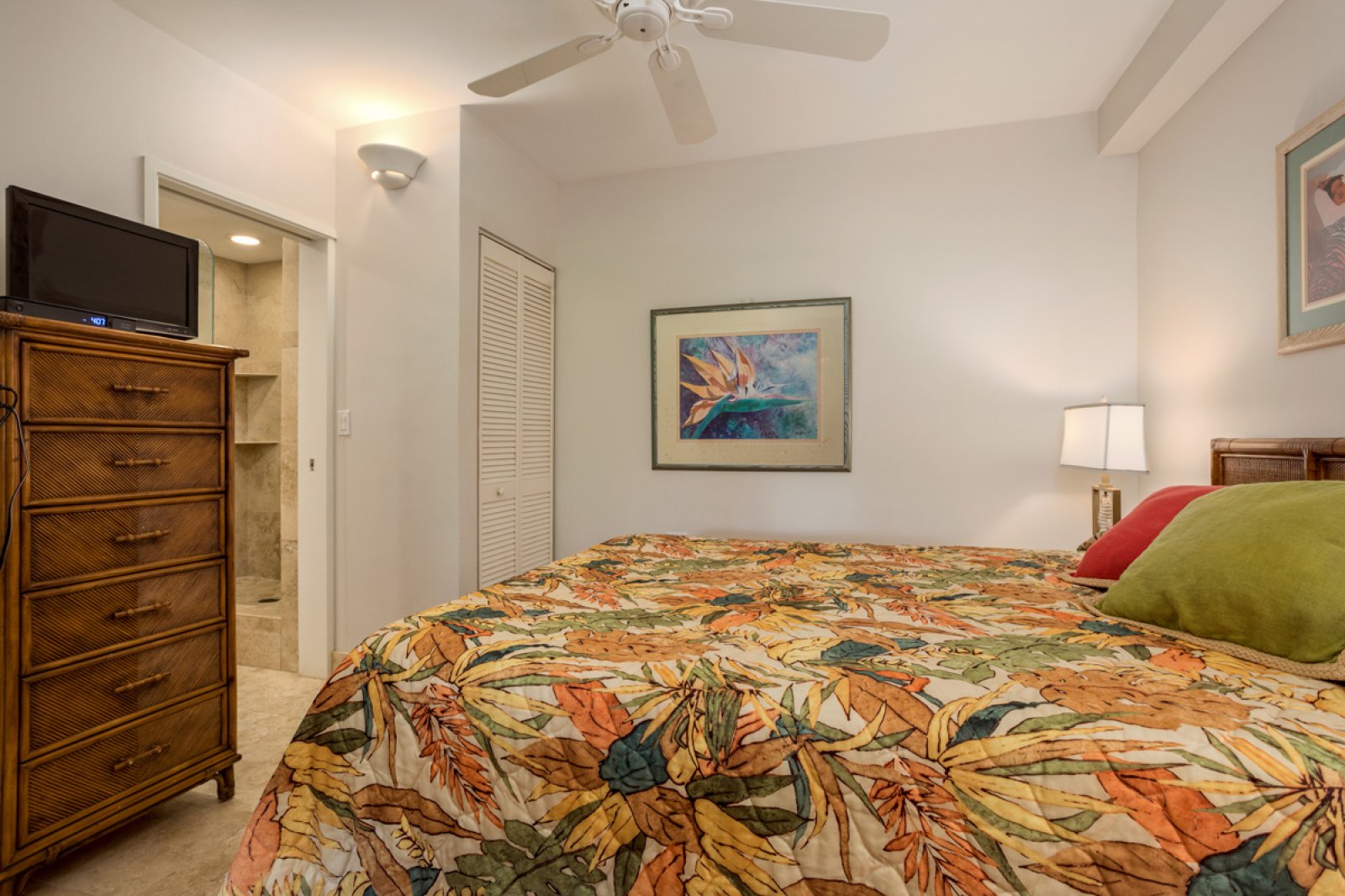 Bed: Queen Bed • Adjacent Bathroom * • TV • Ceiling Fan