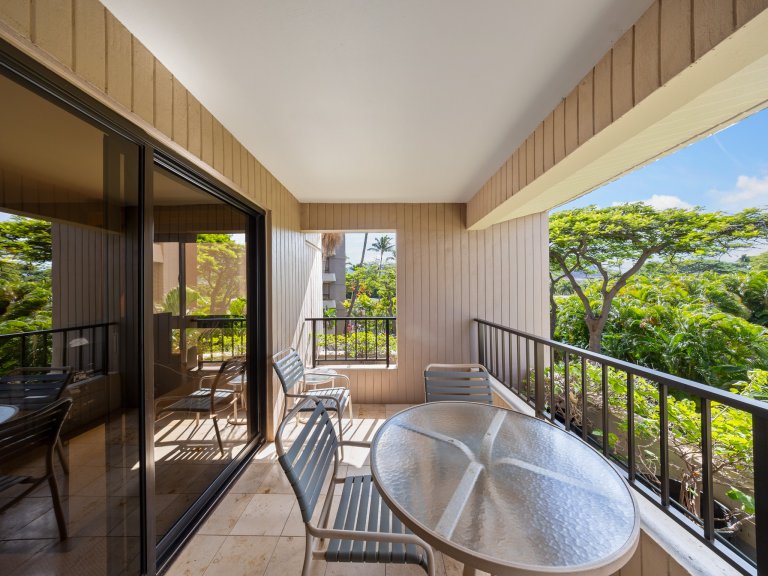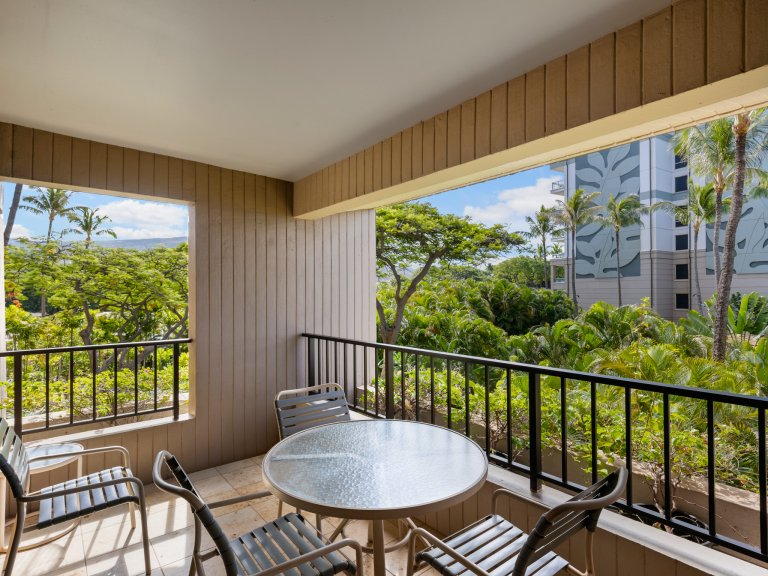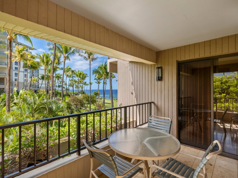 The private lanai features comfortable lounge seating and a table, overlooking tropical gardens with partial ocean views. Located directly on Kaʻanapali Beach, guests enjoy immediate access to golden sands, gentle surf, and scenic coastal walks.Residence Features