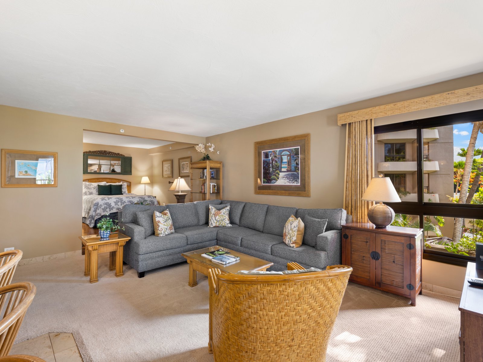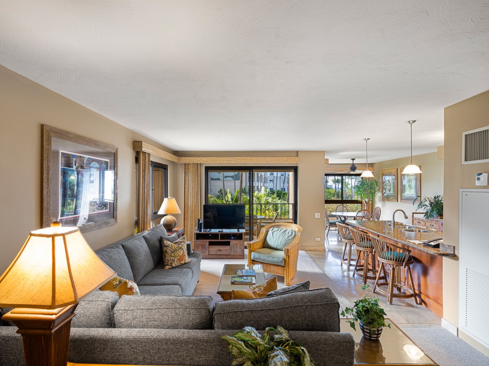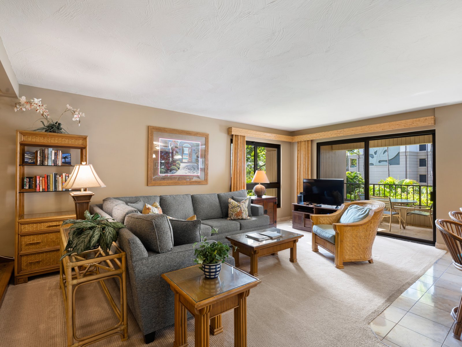 Welcome to Residence 332, a beautifully updated one-bedroom condominium with sleeping den located within the oceanfront grounds of Kaʻanapali Alii Resort. Positioned on the third floor, this refined garden-view retreat enjoys peaceful outlooks over manicured tropical landscaping, nearby green space, and select glimpses of the Pacific Ocean. Expansive windows invite abundant natural light, while the private lanai provides a tranquil setting to enjoy Maui’s warm breezes and lush surroundings.Thoughtfully remodeled in 2025, the residence blends modern comfort with distinctive Hawaiian style. The spacious 1,544-square-foot layout is well suited for both relaxation and entertaining, offering a welcoming atmosphere that feels polished yet effortless.