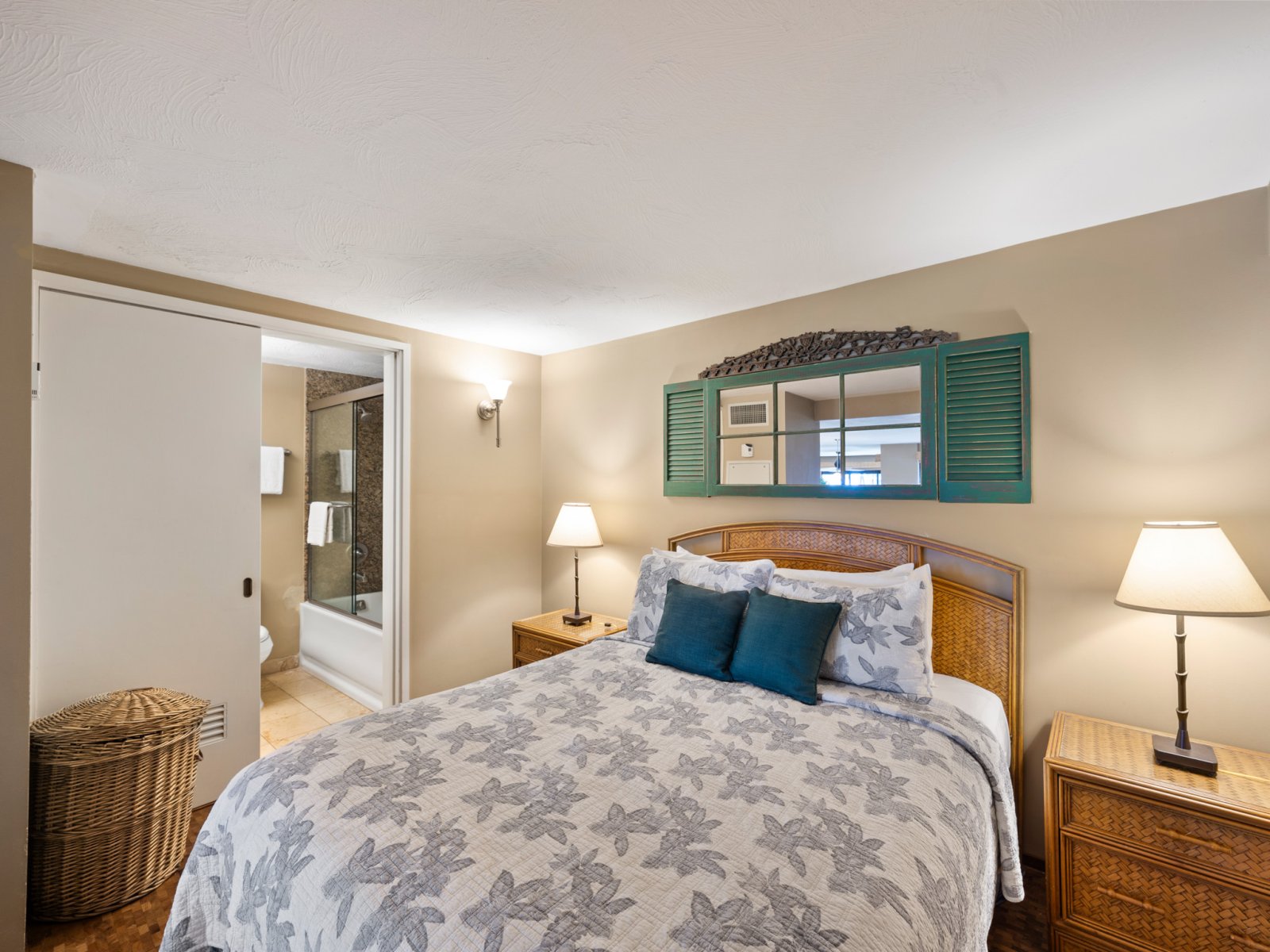 The open living area is designed for comfort and flexibility, featuring stylish seating, curated island furnishings, and an easy indoor-outdoor flow. Sliding doors open to the lanai, extending the living space into the garden setting. A den with closable doors is conveniently located off the living room, offering added privacy for guests or use as a quiet retreat.Sleeping Accommodations | Up to 4 Guests