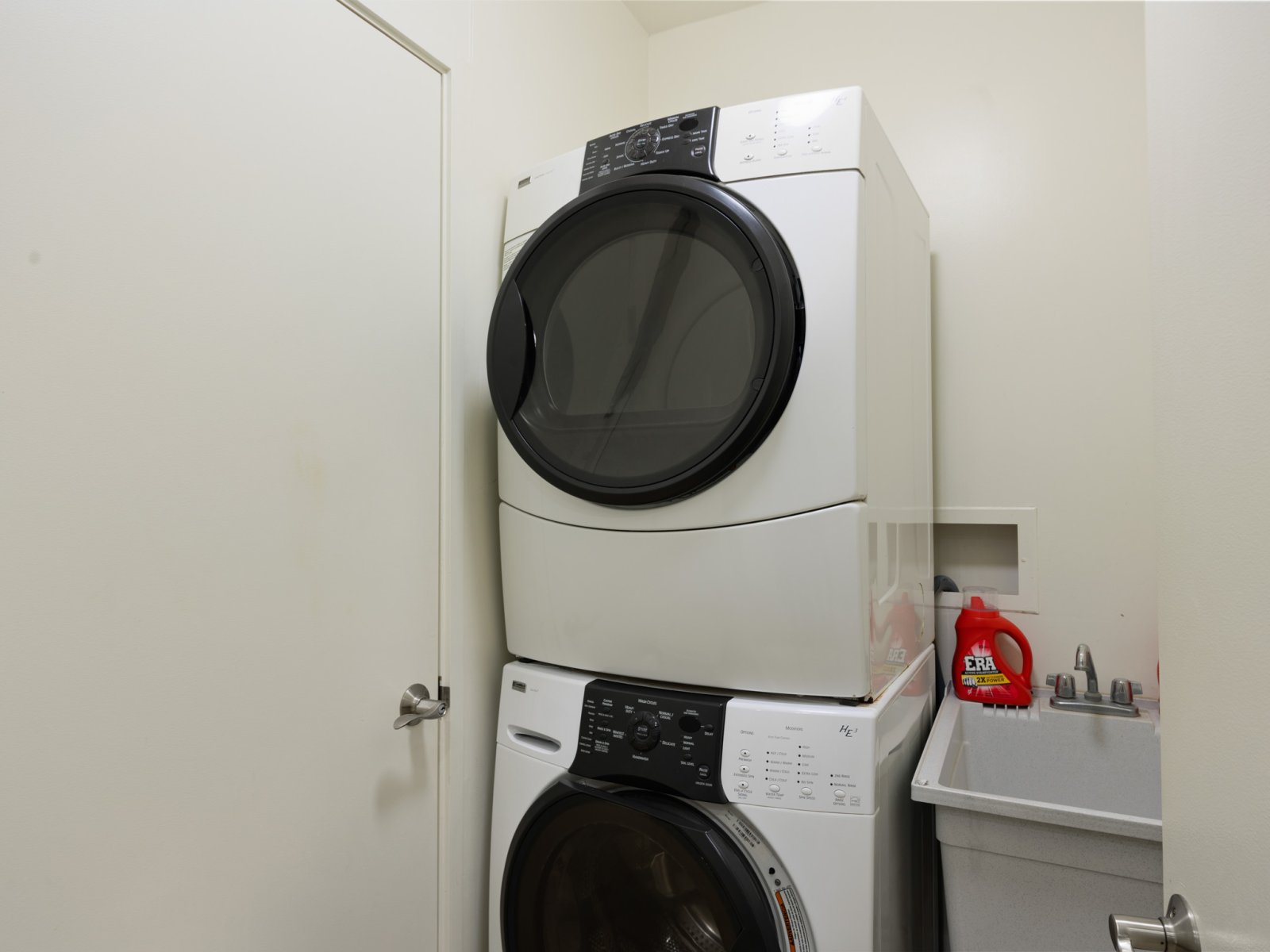 The fully stocked gourmet kitchen is equipped with high-end stainless steel appliances, ample counter space, and modern finishes, making in-residence dining simple and enjoyable. A dining table seats four guests comfortably, creating an inviting space for shared meals. A full-size washer and dryer add convenience for extended stays.Outdoor Living