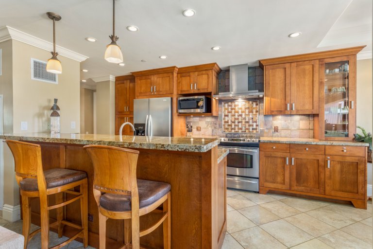 The gourmet kitchen is a standout feature, offering warm wood cabinetry, contemporary stainless steel appliances, and elegant marble countertops. Fully stocked and designed for ease, it’s perfect for preparing anything from casual breakfasts to celebratory dinners.Adjacent to the kitchen, a separate dining room provides seating for six and showcases spectacular ocean views, turning every meal into a special occasion. A full-size washer and dryer add convenience for longer stays.