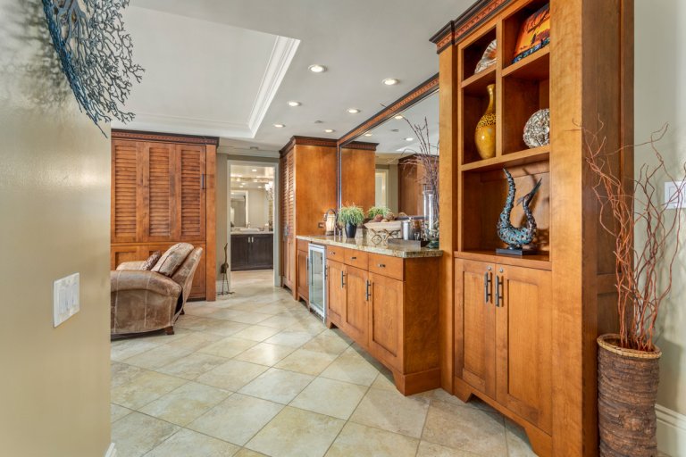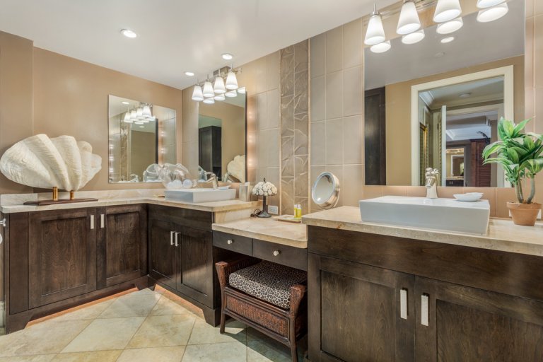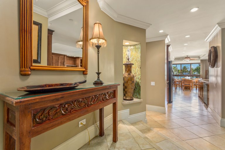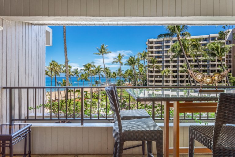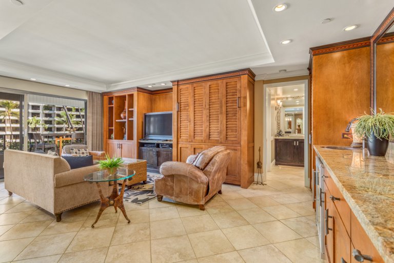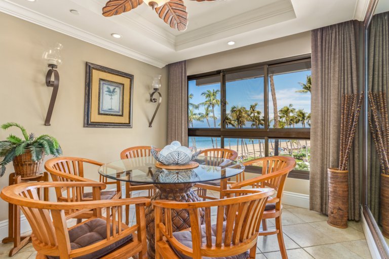 The private lanai is furnished with lounge chairs and a dining table for six, ideal for enjoying al fresco meals, morning coffee, or sunset cocktails. Overlooking the lush grounds and ocean beyond, the lanai places you directly on Kaʻanapali Beach, just steps from the sand and surf.Residence Features