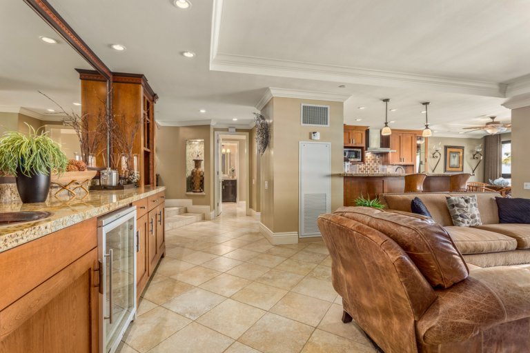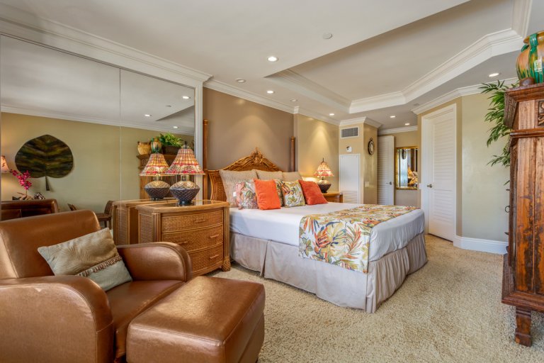 The welcoming living room is designed for both comfort and connection. A plush sofa, two distinctive lounge chairs, and a flat-screen TV create a relaxing gathering space. A wide mirrored wet bar with a built-in wine refrigerator adds a touch of sophistication and makes entertaining effortless. Sliding doors open to the private lanai, extending the living area outdoors.Sleeping Accommodations | Up to 6 Guests