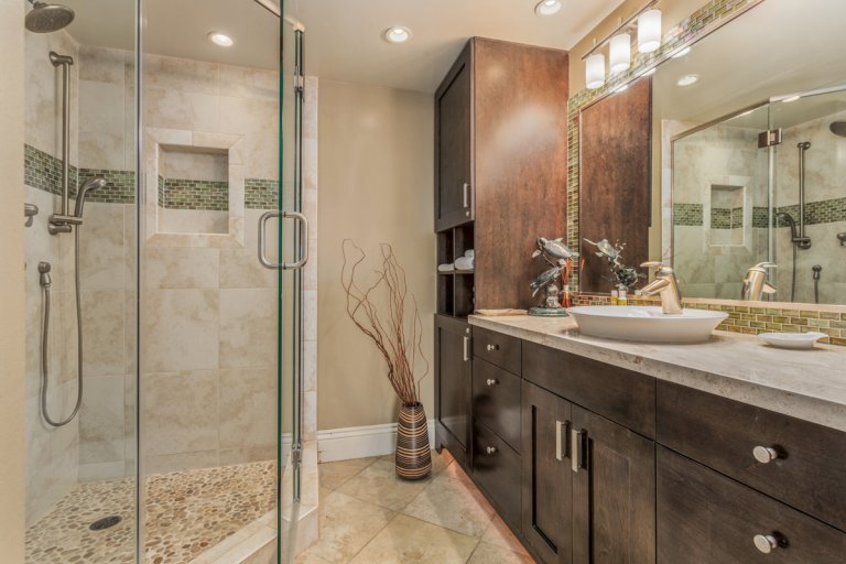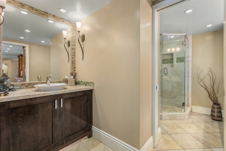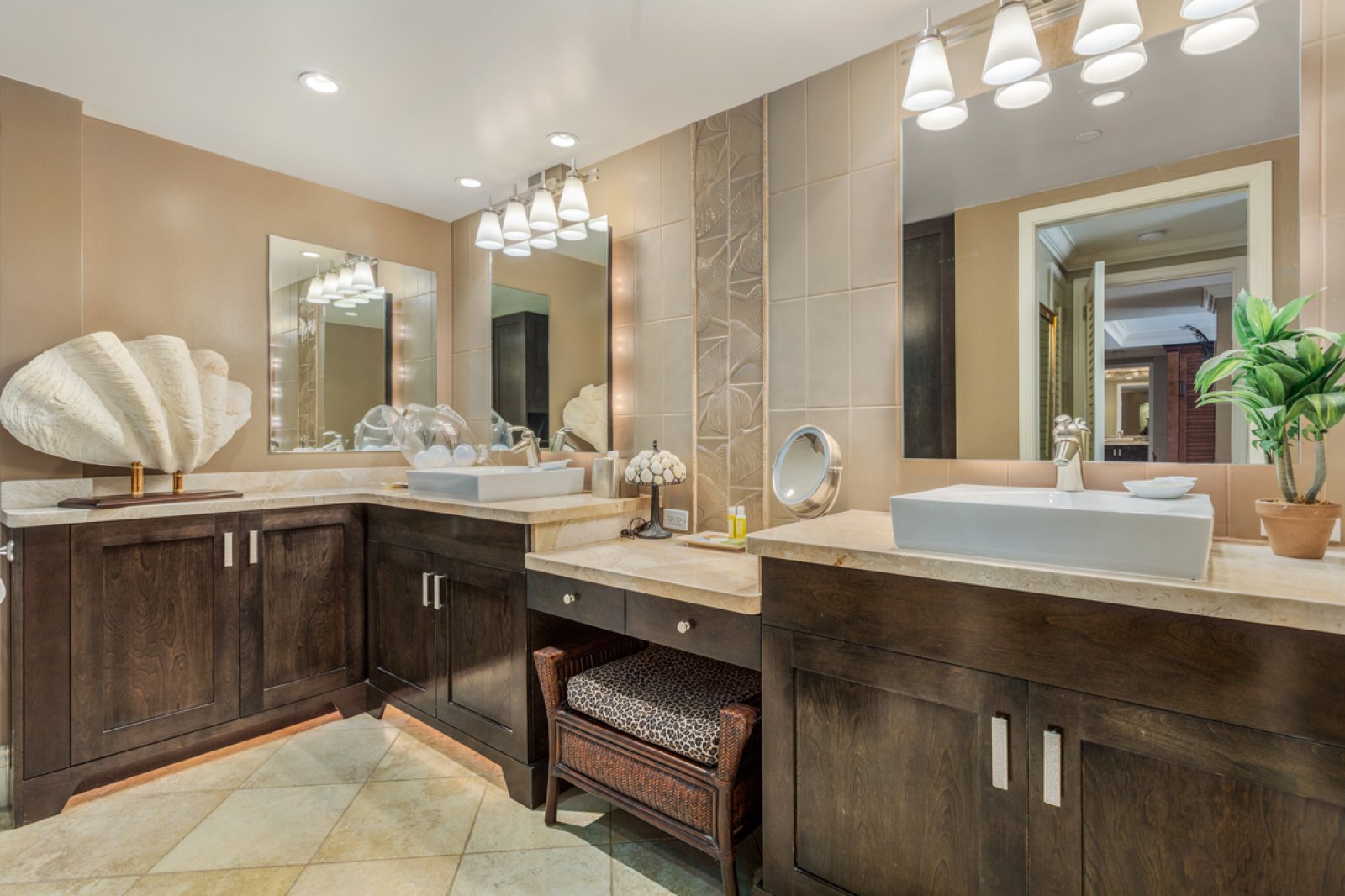 California king bed, leather lounger with ottoman, and an intricately carved wood TV armoire. The en-suite primary bathroom features twin vanities with tiled accents and a luxurious walk-in glass shower.