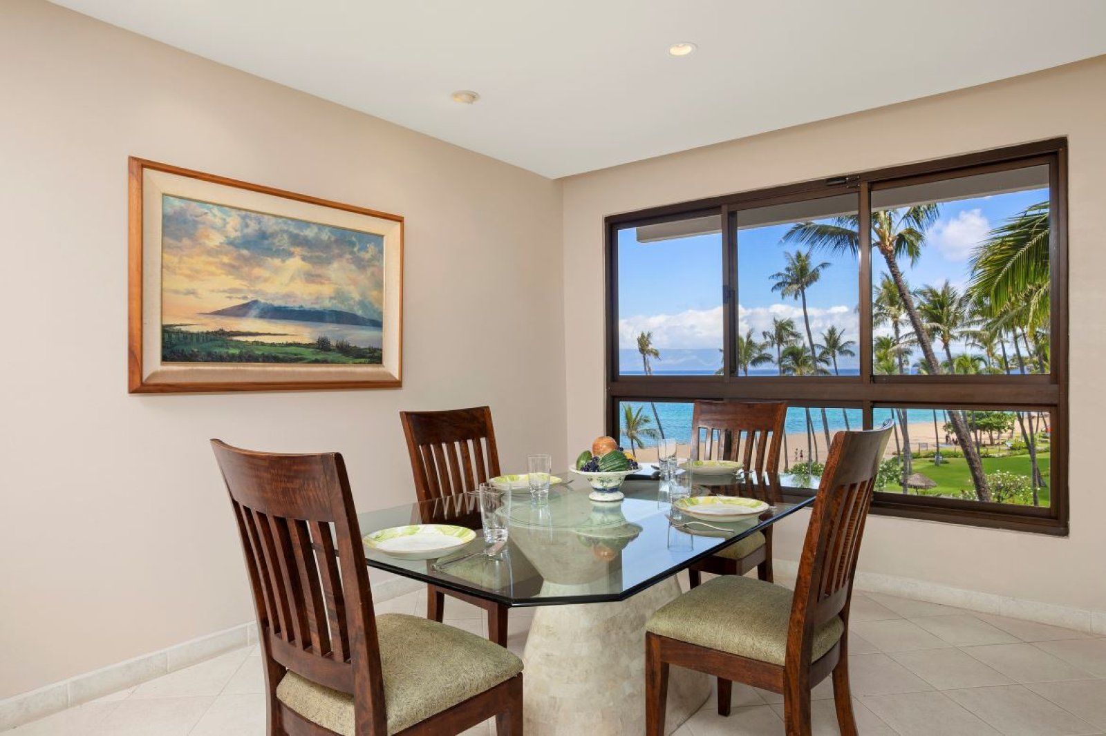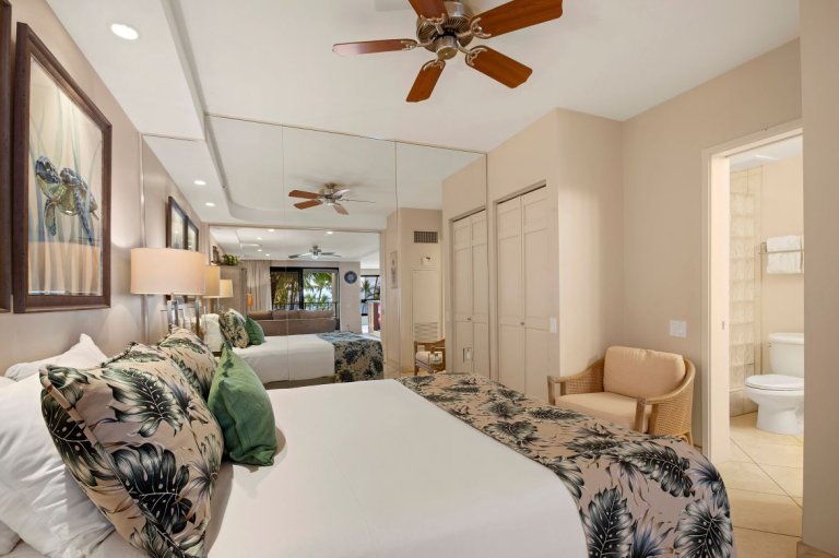 The open-concept living and dining area is beautifully decorated and filled with natural light. Comfortable seating invites you to unwind after a day at the beach, while expansive windows frame stunning ocean views. Step outside to the private lanai to enjoy morning coffee, gentle ocean breezes, or sunset cocktails overlooking the water.Sleeping Accommodations |Up to 4 Guests