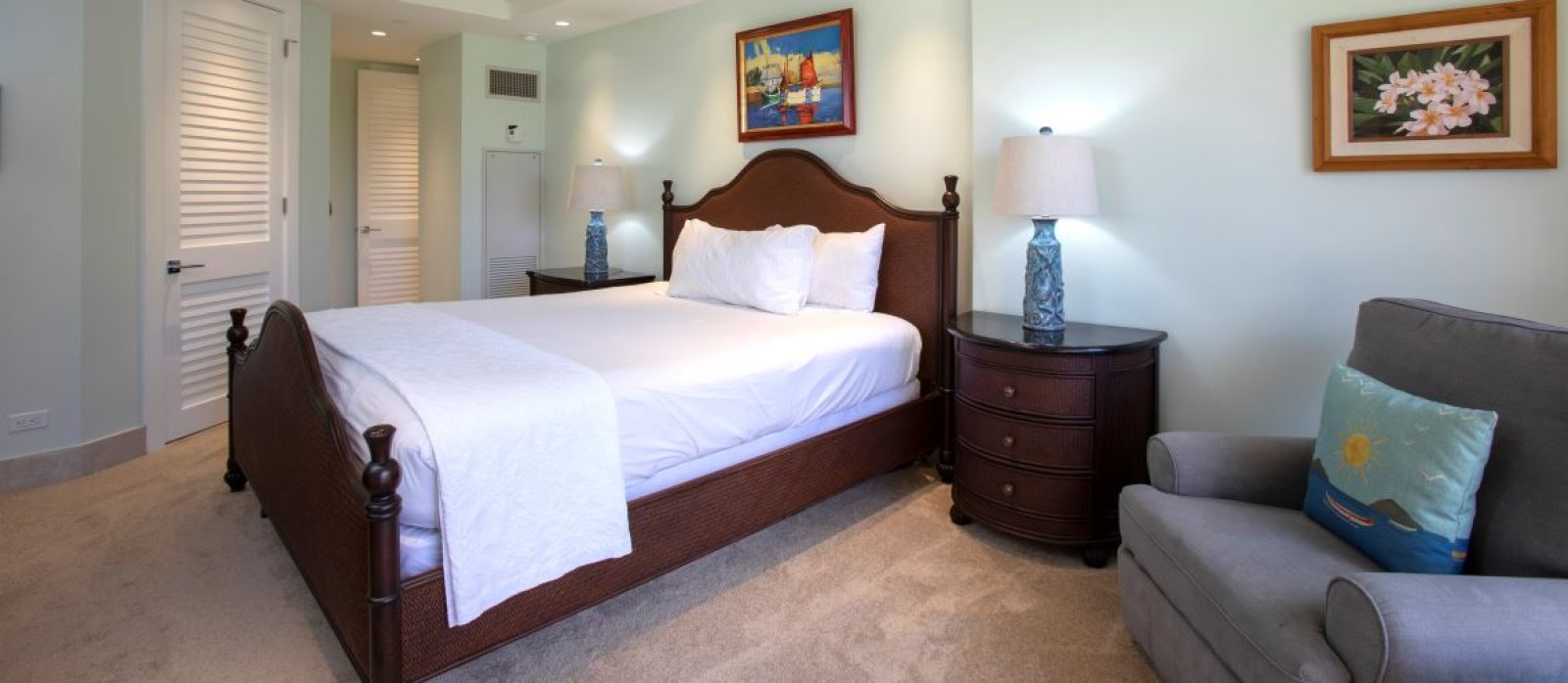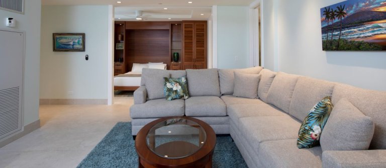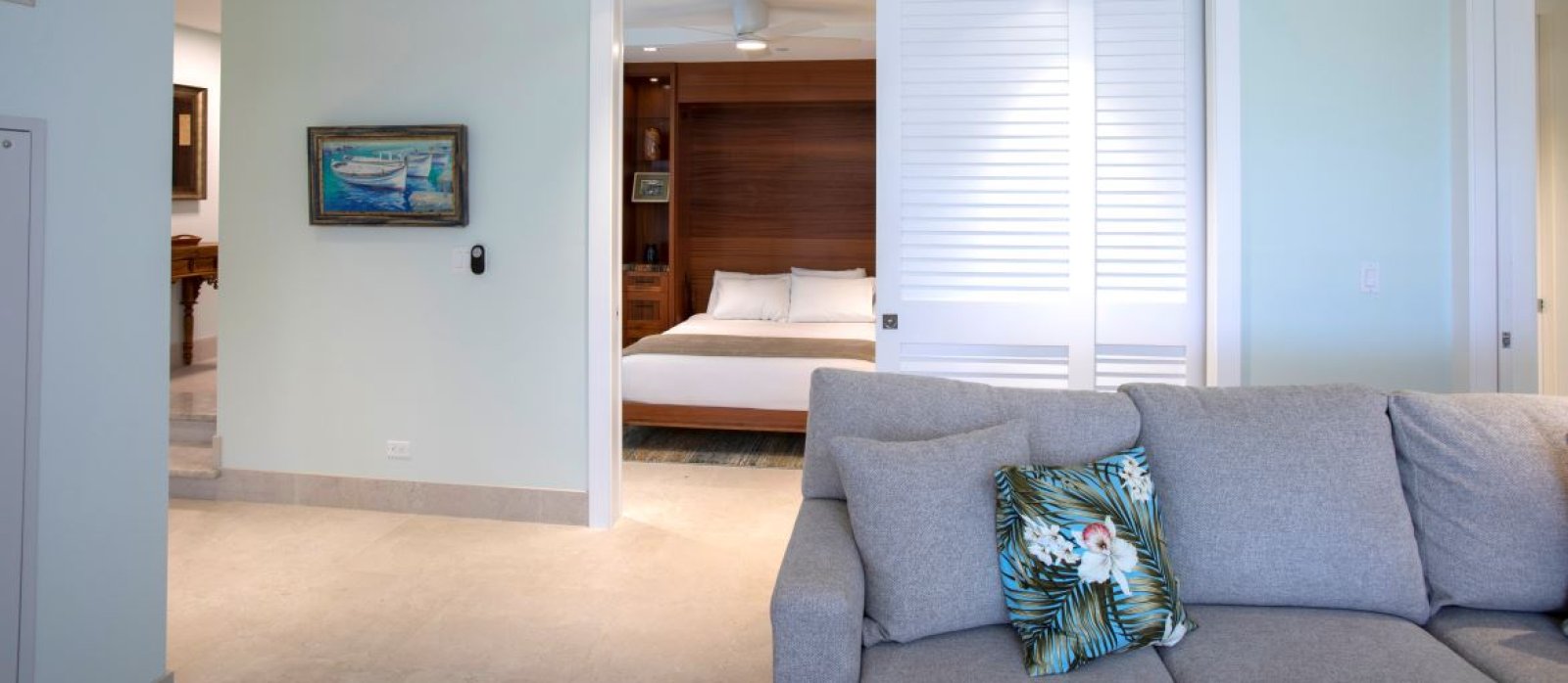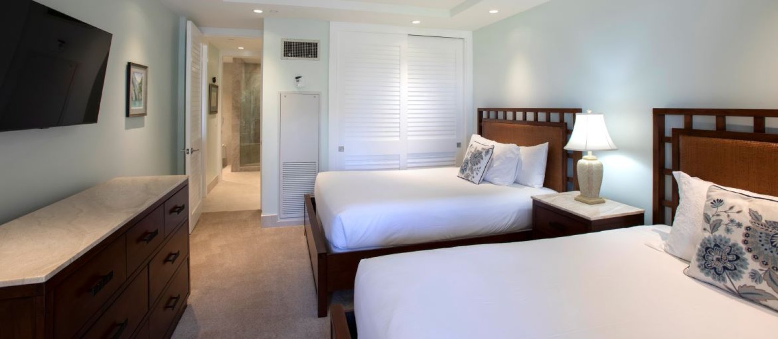 The open-concept living and dining areas flow effortlessly, creating a welcoming space for gathering and entertaining. Elegant furnishings, coastal-inspired accents, and large windows frame sweeping ocean and garden views. Sliding doors allow the enclosed den to transform into a private sleeping suite with a wall-mounted TV and direct access to a full bathroom—eliminating the need for a sofa bed while maximizing comfort and privacy.Sleeping Accommodations | Up to 6 Guests