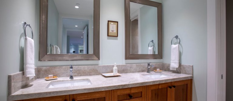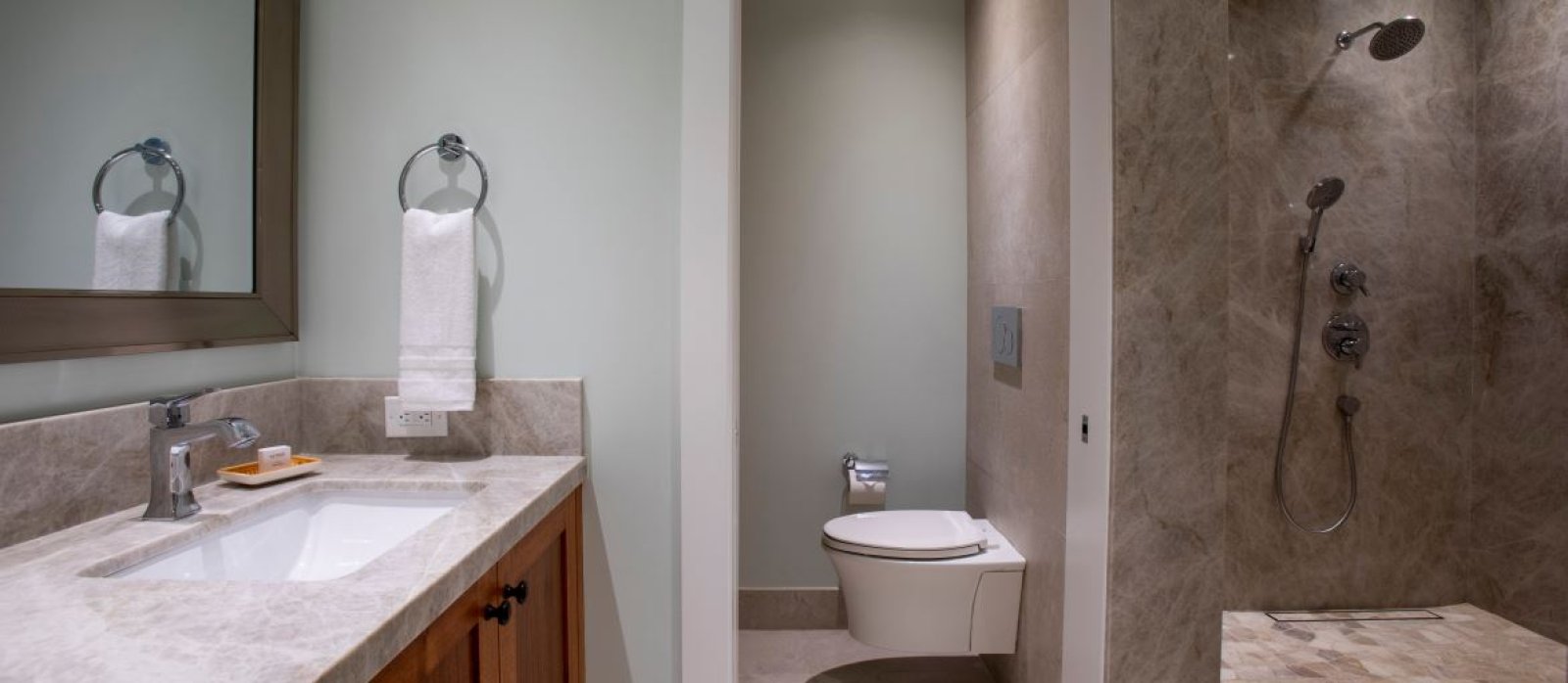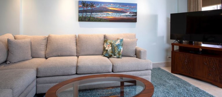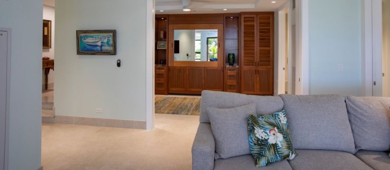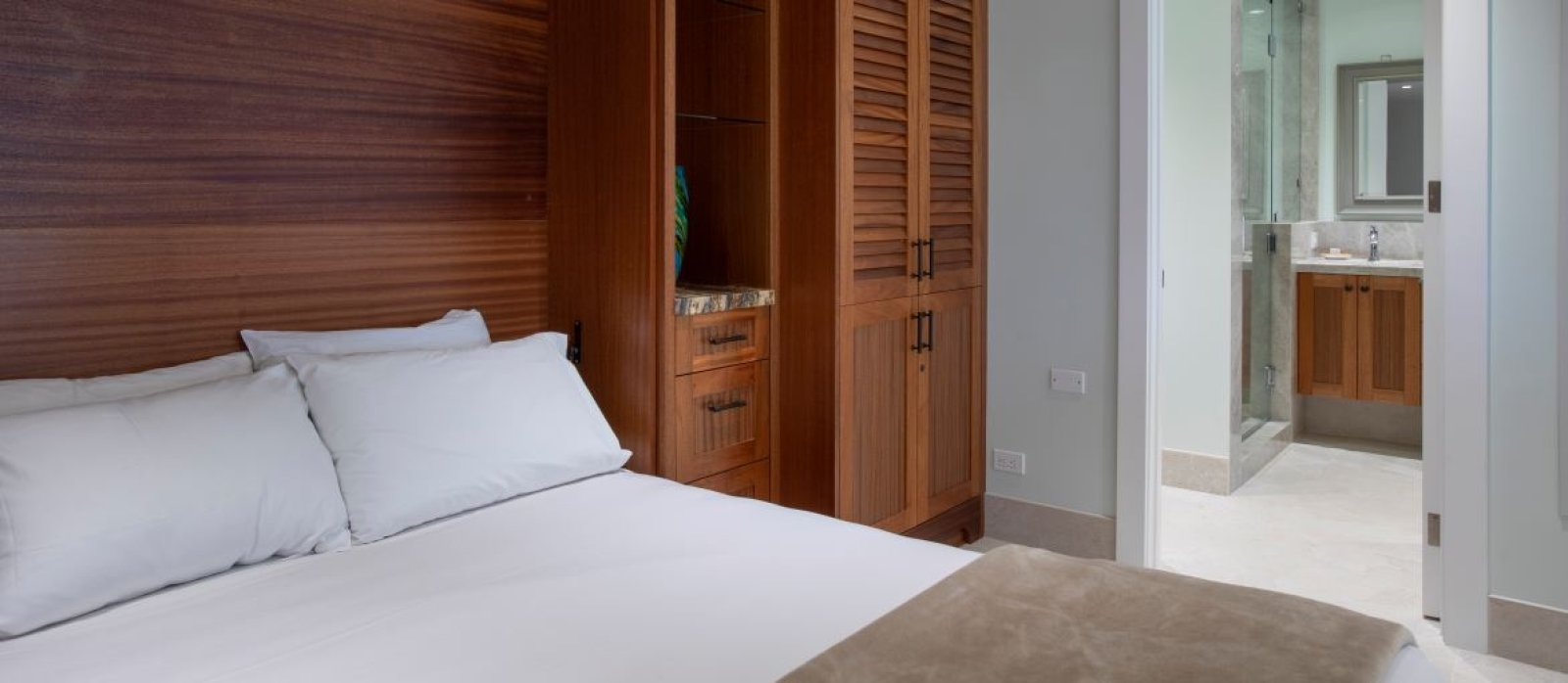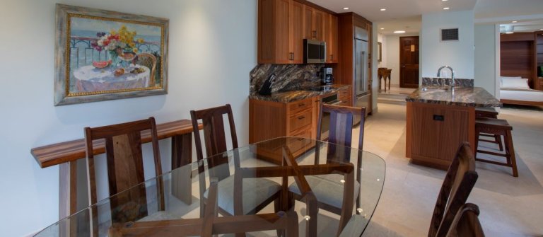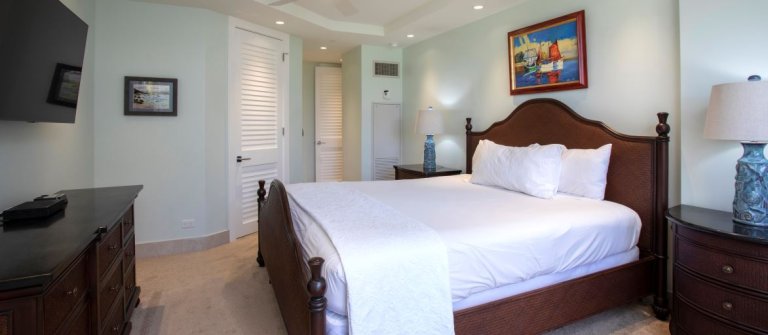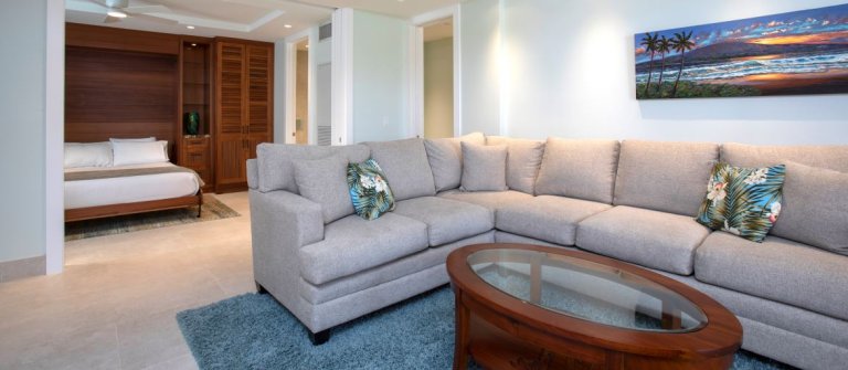 The open-concept living and dining areas flow effortlessly, creating a welcoming space for gathering and entertaining. Elegant furnishings, coastal-inspired accents, and large windows frame sweeping ocean and garden views. Sliding doors allow the enclosed den to transform into a private sleeping suite with a wall-mounted TV and direct access to a full bathroom—eliminating the need for a sofa bed while maximizing comfort and privacy.Sleeping Accommodations | Up to 6 Guests