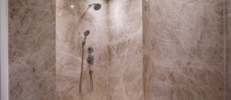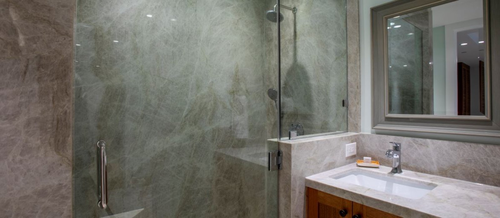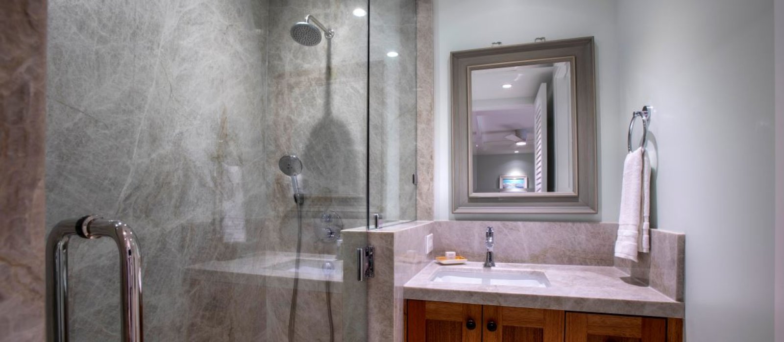 • Primary BedroomCalifornia king-size bed and en-suite bathroom featuring a custom walk-in rain shower and soaking tub.