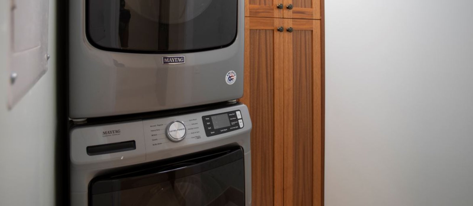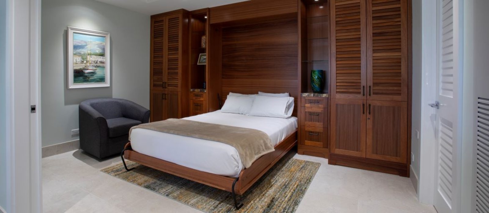 Fully enclosed with a queen Murphy bed, sliding privacy doors, and convenient access to a full bathroom.
