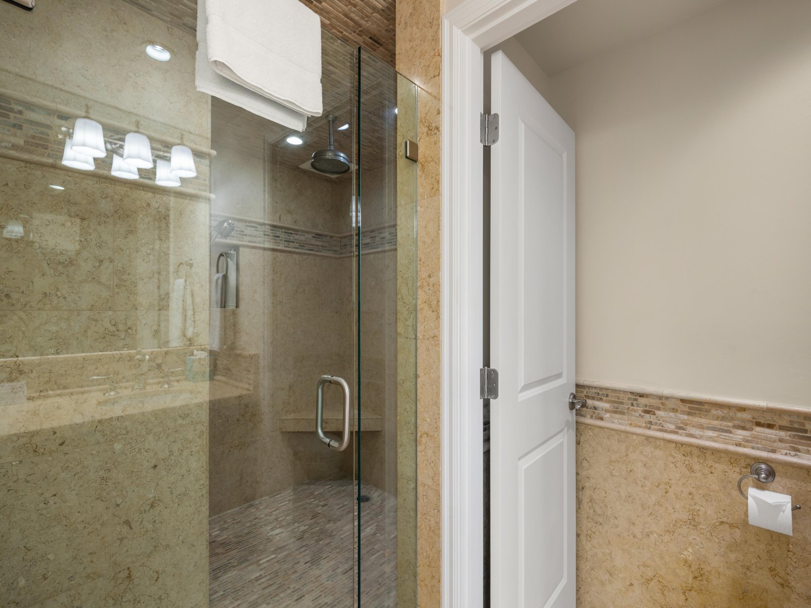 Two modern bathrooms, featuring one walk-in shower and one shower/tub combination.