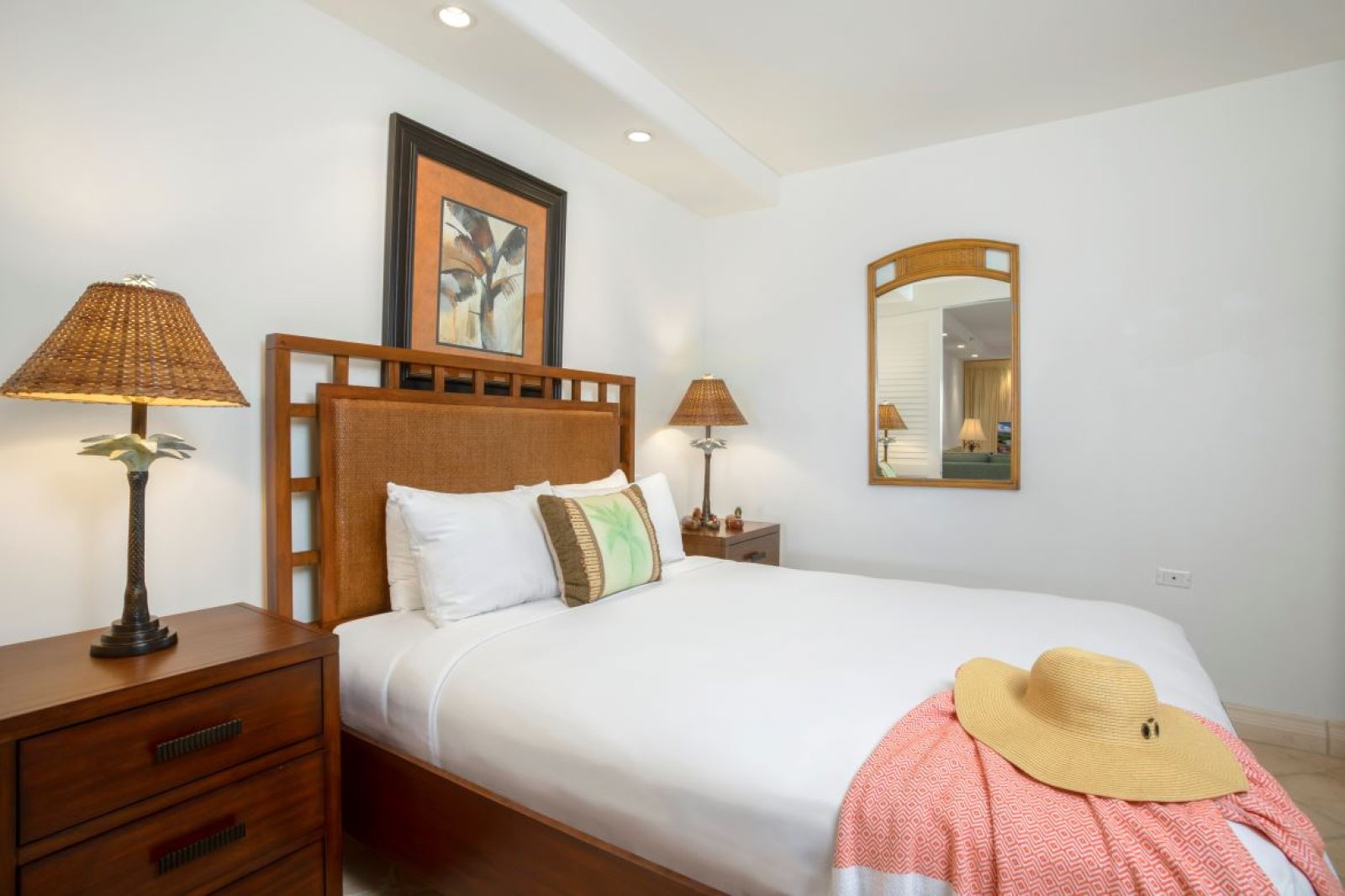The living area opens seamlessly to the lanai and features comfortable seating, natural light, and ocean views that remain front and center throughout the space. Sliding partition doors allow the adjacent den to be enclosed for privacy, providing flexible living and sleeping options.Sleeping Accommodations | Up to 4 Guests