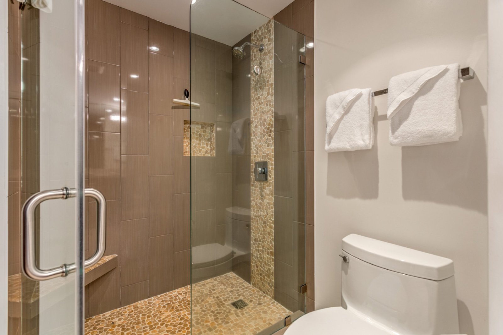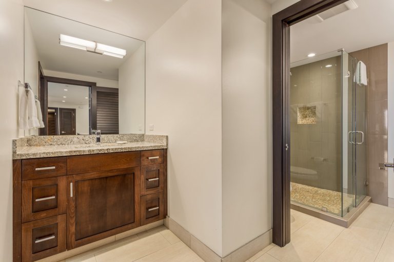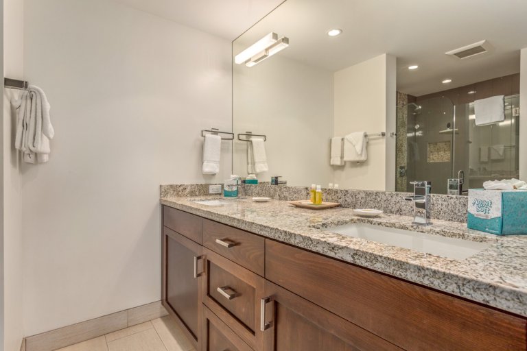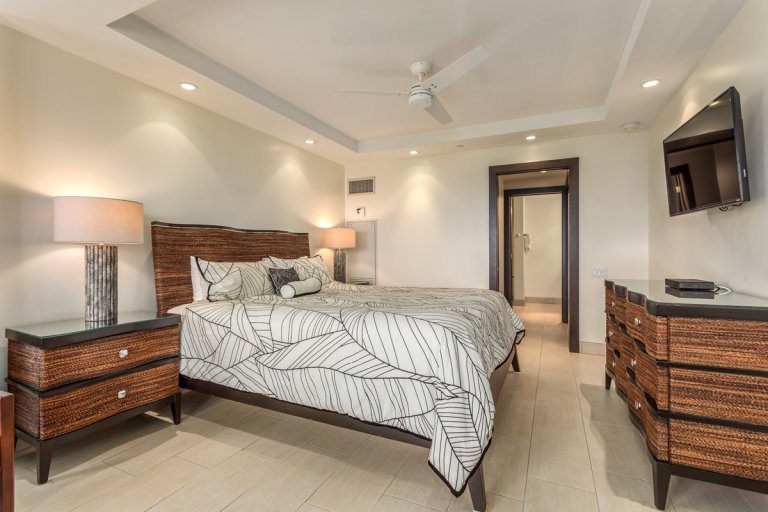 • Primary BedroomThe primary suite offers a peaceful retreat with a king bed, a wide desk and chair, and two cushioned lounge chairs positioned to enjoy the ocean view. A mirror accent wall reflects tropical scenery into the room, enhancing both light and space. The en-suite bathroom features dual vanities and a glass walk-in shower.