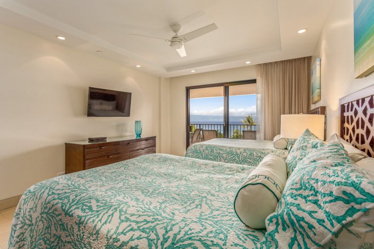 The second bedroom opens directly onto the oceanview lanai and offers flexible accommodations with two full beds. The adjacent bathroom includes a glass walk-in shower, with one vanity located separately and an additional vanity positioned near the shower for added convenience.