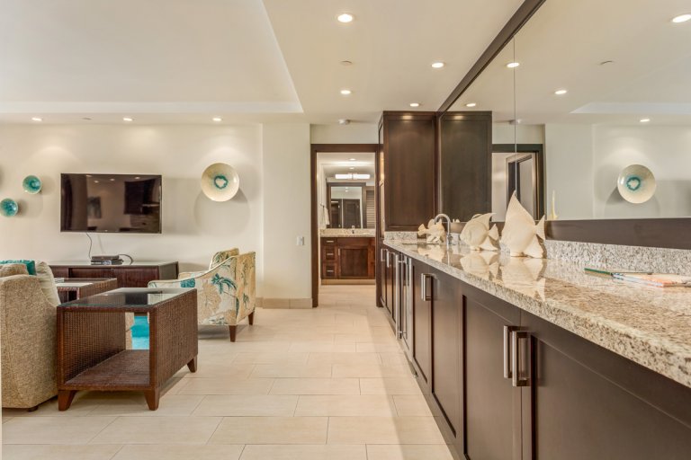 The open living area is designed as a central gathering space, anchored by a cushioned sofa and two lounge chairs arranged around a flat-screen television. This comfortable layout invites shared evenings, whether enjoying a movie or watching the game together. Dark wood cabinetry continues from the kitchen into the living area, adding warmth and visual cohesion.An extra-wide bar counter enhances the functionality of the space and features three cushioned bar stools, a wet bar, and a wine refrigerator. An expansive framed mirror reflects the ocean view, amplifying natural light and creating a sense of openness throughout the room.