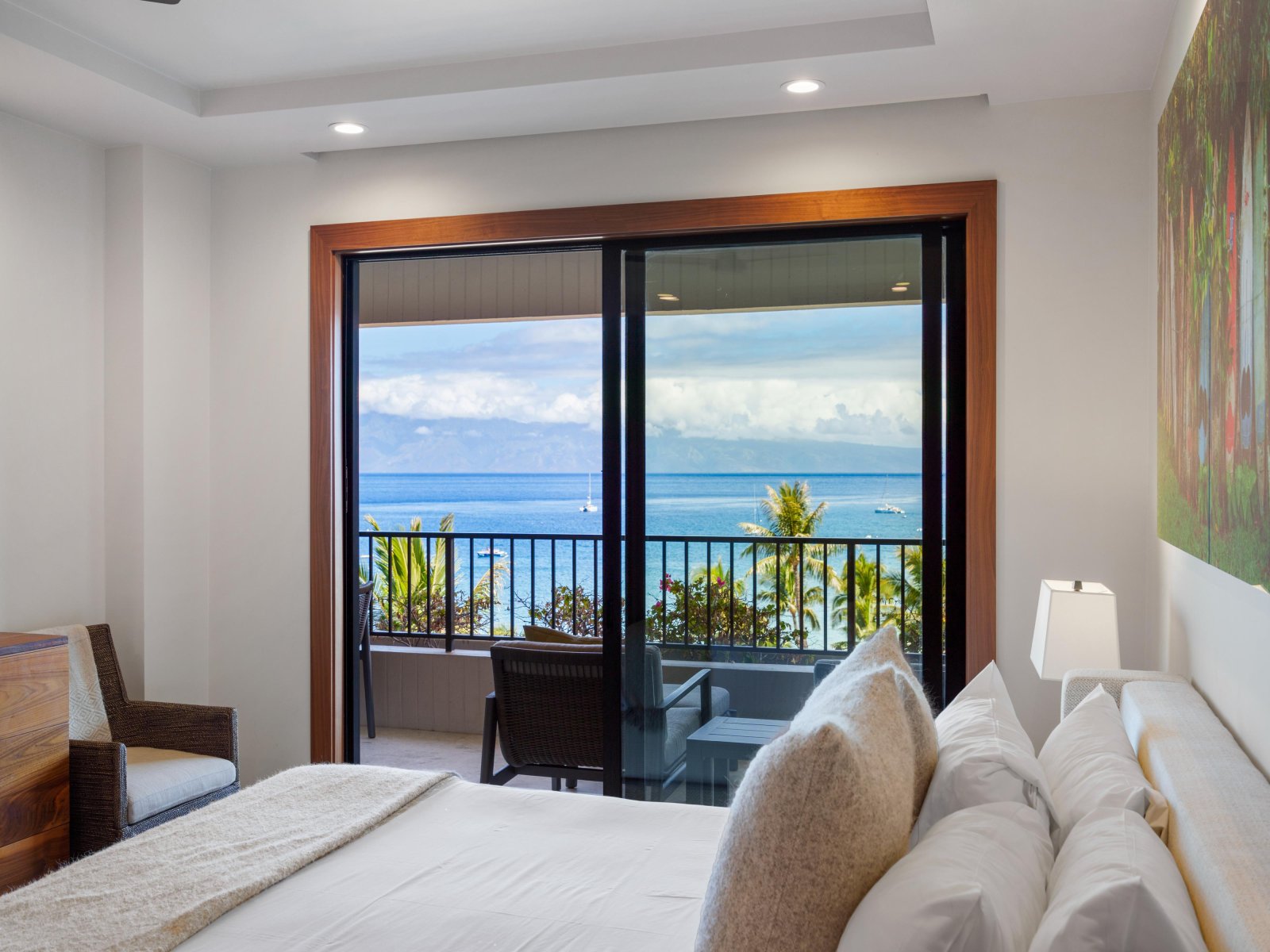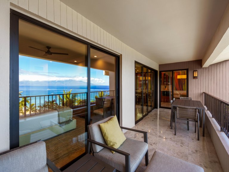 The private oceanview lanai extends the living space outdoors and is furnished with lounge chairs and a table. It is an ideal setting for morning coffee, sunset cocktails, or quiet moments spent listening to the waves. Located directly on Kaʻanapali Beach, the residence offers immediate access to swimming, beach walks, and ocean activities.Residence Features