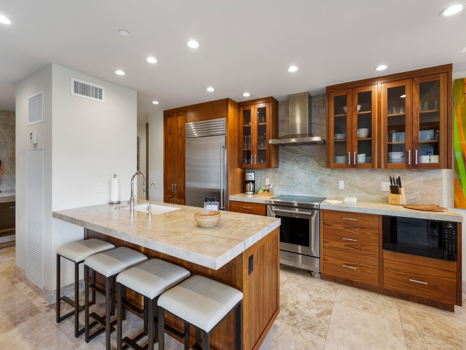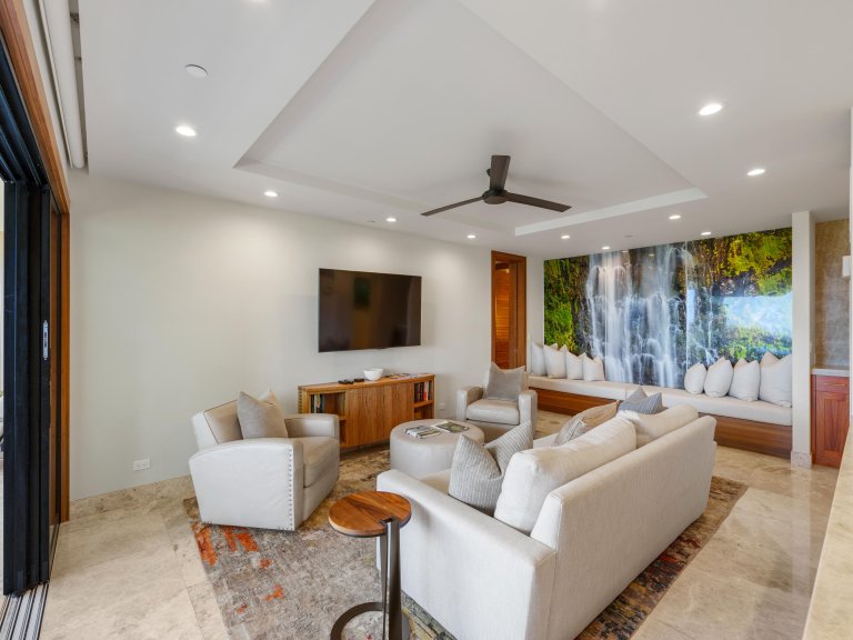 The open living area is designed for comfort and connection, with a stylish lounge arrangement positioned to enjoy ocean views throughout the day. Large windows frame the Pacific and allow natural light to fill the space, enhancing the vibrant yet balanced island aesthetic. The layout flows easily into the dining and kitchen areas, making it ideal for shared time with family or friends.Sleeping Accommodations | Up to 4 Guests