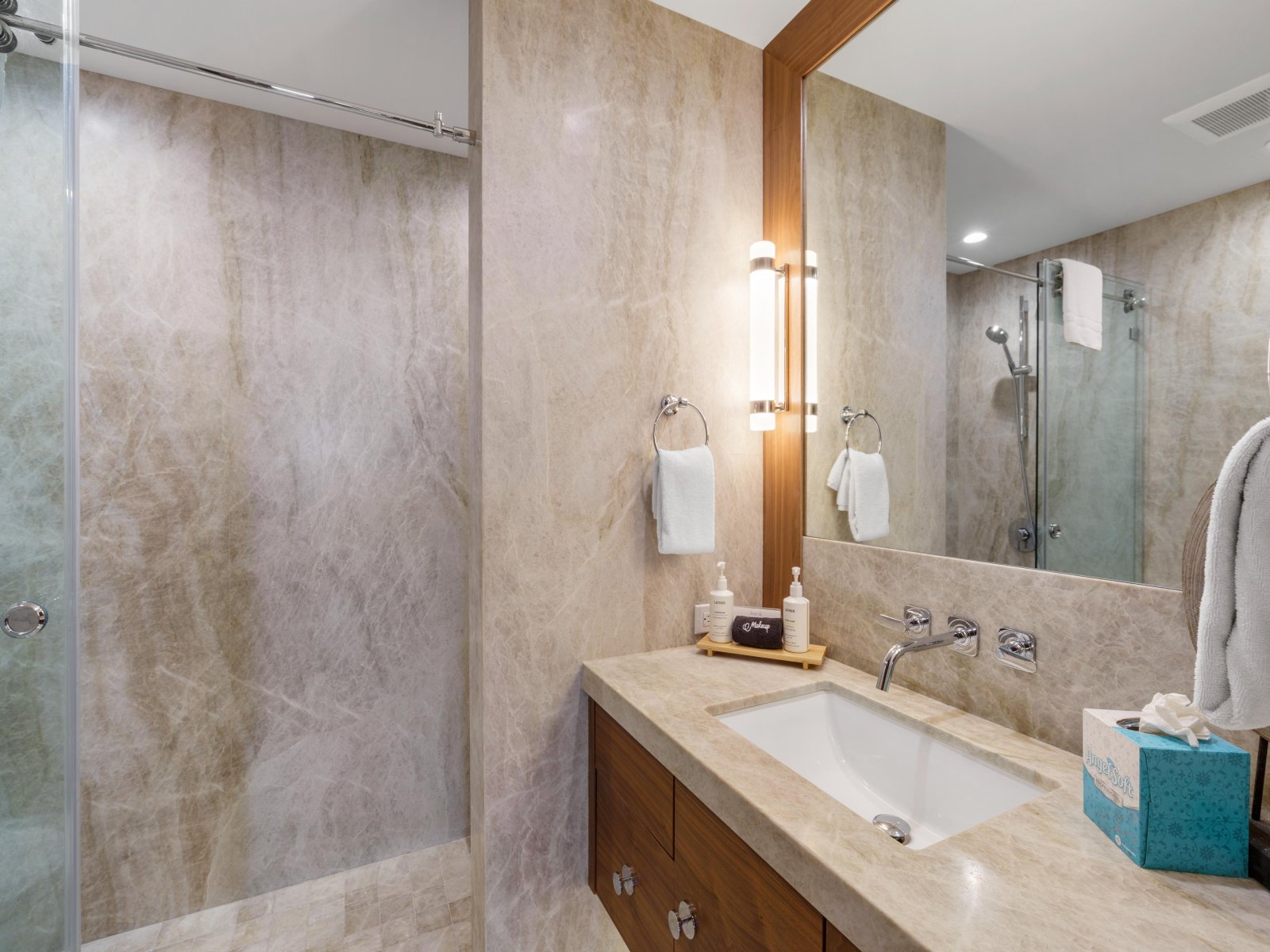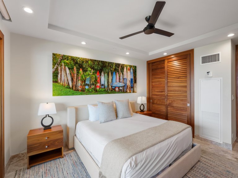 • Oceanview Primary SuiteThe primary bedroom features a California king bed, soothing décor, and generous space to unwind. The en-suite bathroom includes a walk-in shower and refined finishes that create a spa-like experience.