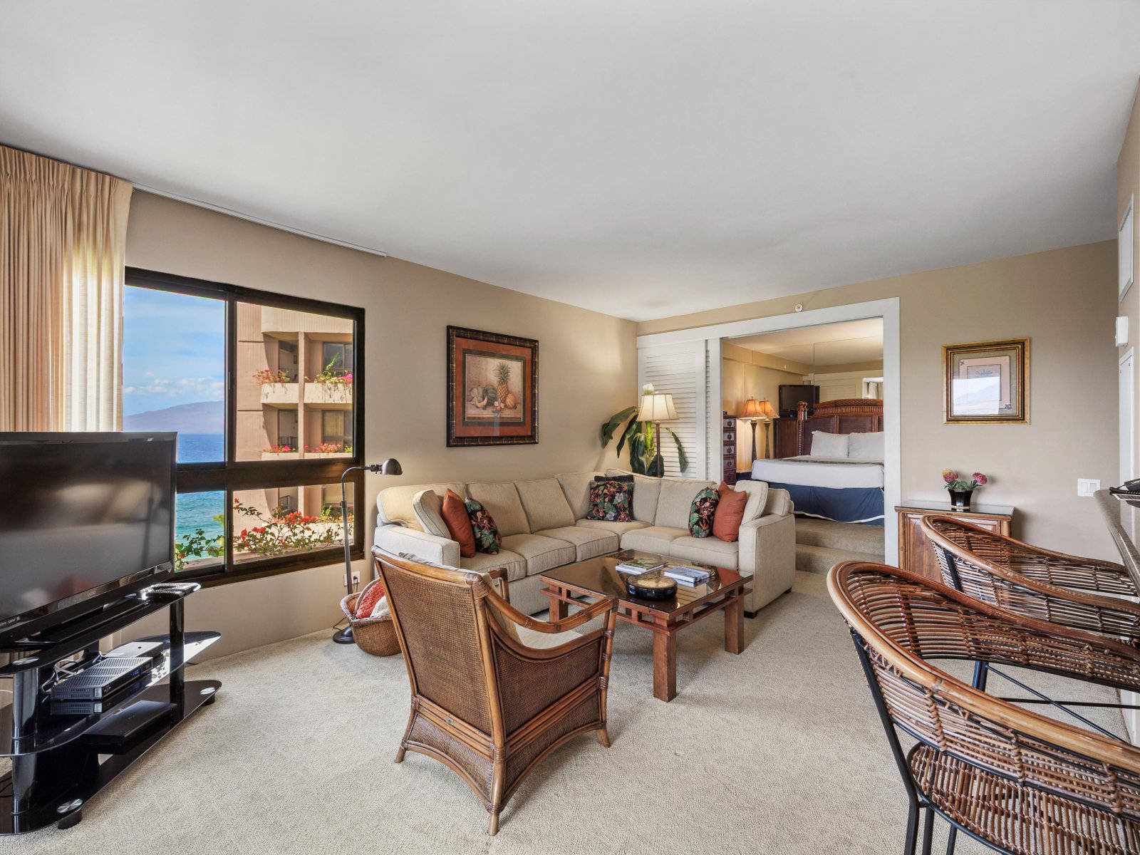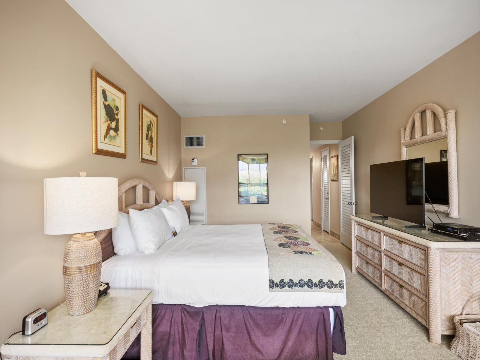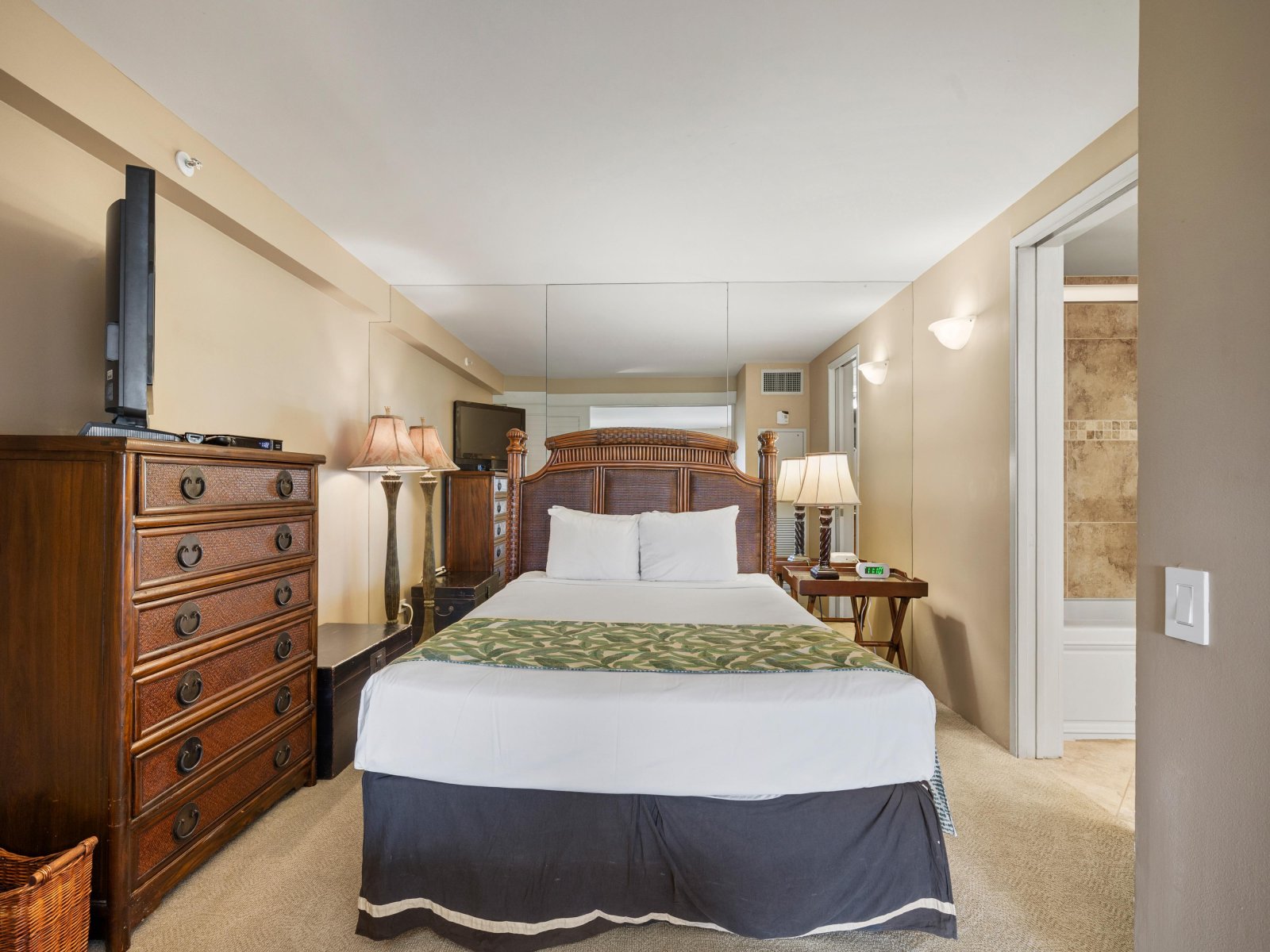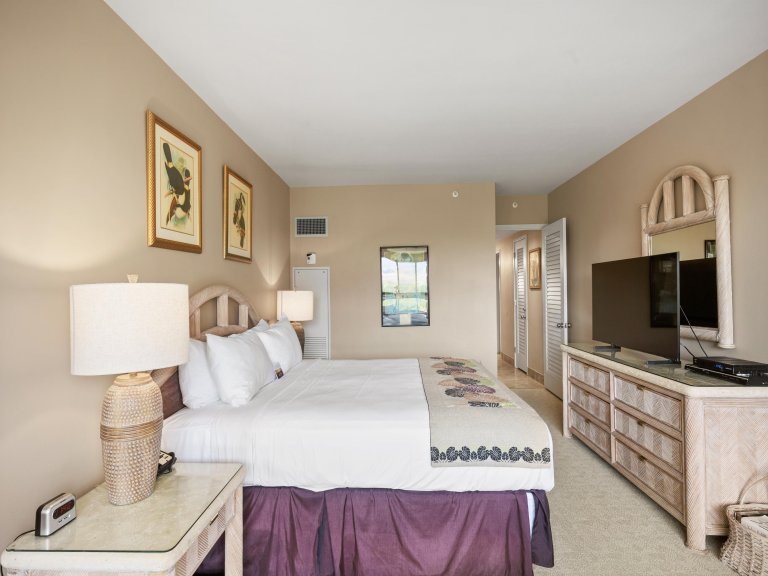 • Primary BedroomThe primary suite features a California king bed, serene island décor, and convenient access to a well-appointed bathroom. It’s a peaceful retreat perfect for rest and relaxation.
