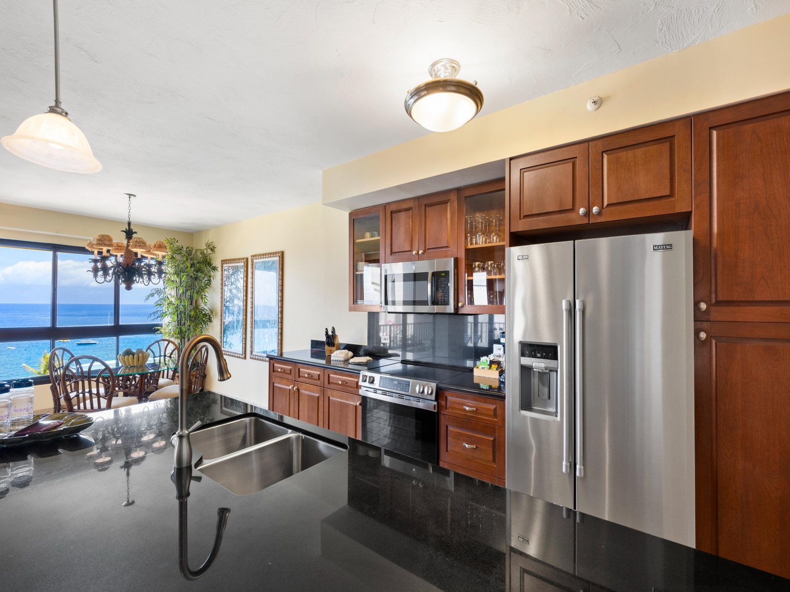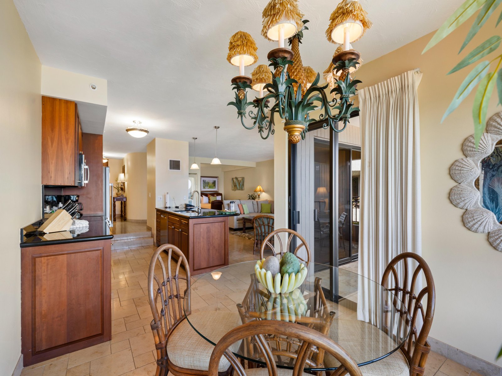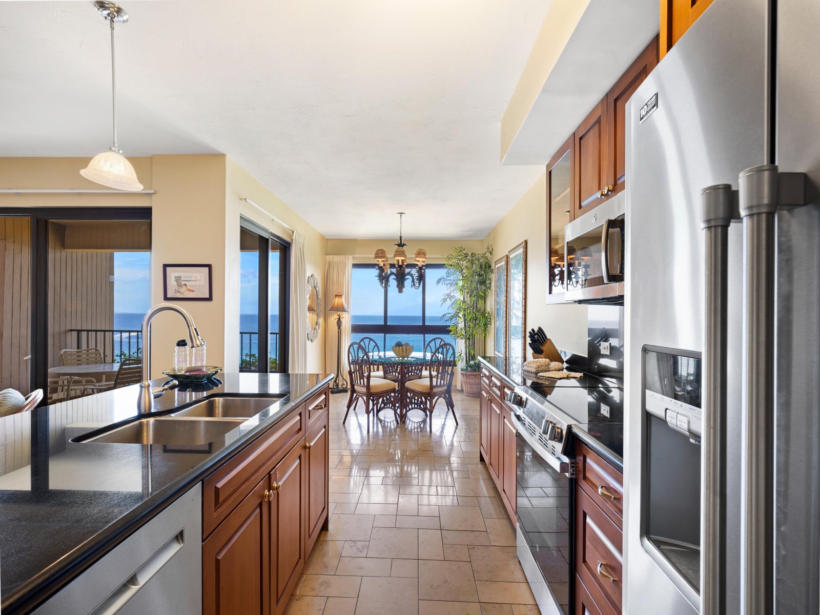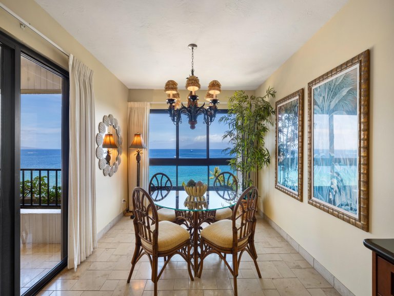 The gourmet kitchen is fully equipped with wood cabinetry, granite countertops, and modern stainless steel appliances, making it easy to prepare everything from light breakfasts to elegant dinners. A dining table for four is positioned near expansive windows, allowing meals to be enjoyed with uninterrupted ocean views. Guests may also choose to dine outdoors on the lanai, accompanied by ocean breezes and the sound of the waves.Outdoor Living