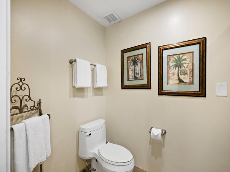 The den offers a queen bed and functions as a comfortable second sleeping area, ideal for additional guests. A second full bathroom with a shower and tub combination is conveniently located nearby.